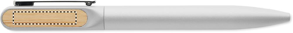 Drehkugelschreiber mit Schaft aus recyceltem Aluminium, oberer Part aus recyceltem ABS mit Inlay aus Bambus und Clip aus Metall. Blaue Tinte.