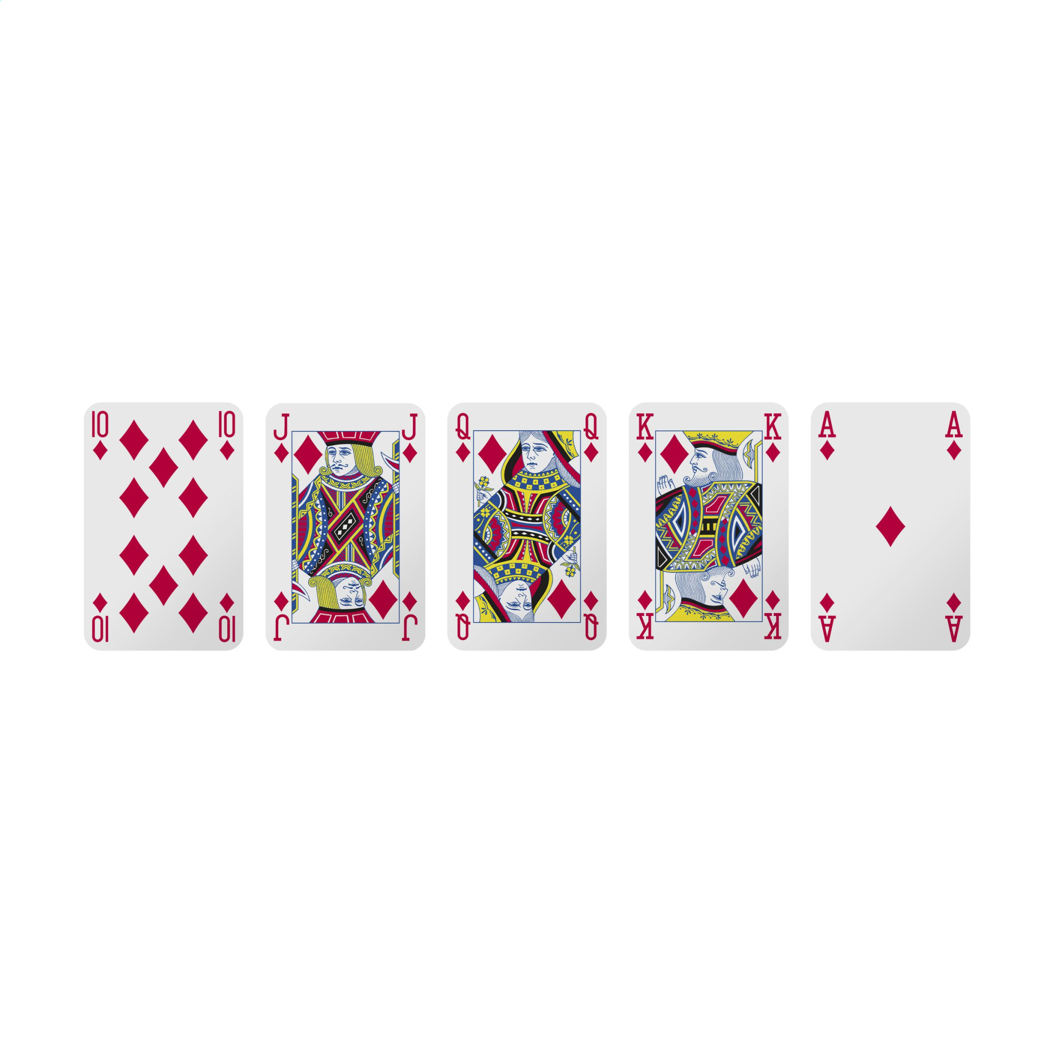 Spielkarten aus stabilem 300-Gramm-Karton. Diese Kartendecks bestehen aus 52 Spielkarten und 2 Jokern. Verpackt in einer Kartonschachtel mit Zellophan. Sie können Ihr vollfarbiges Design auf die Rückseite der Karten und auch auf die Schachtel auftragen und so ein einzigartiges, personalisiertes Kartendeck erstellen, das Ihre Marke bei jedem Spiel fördert.