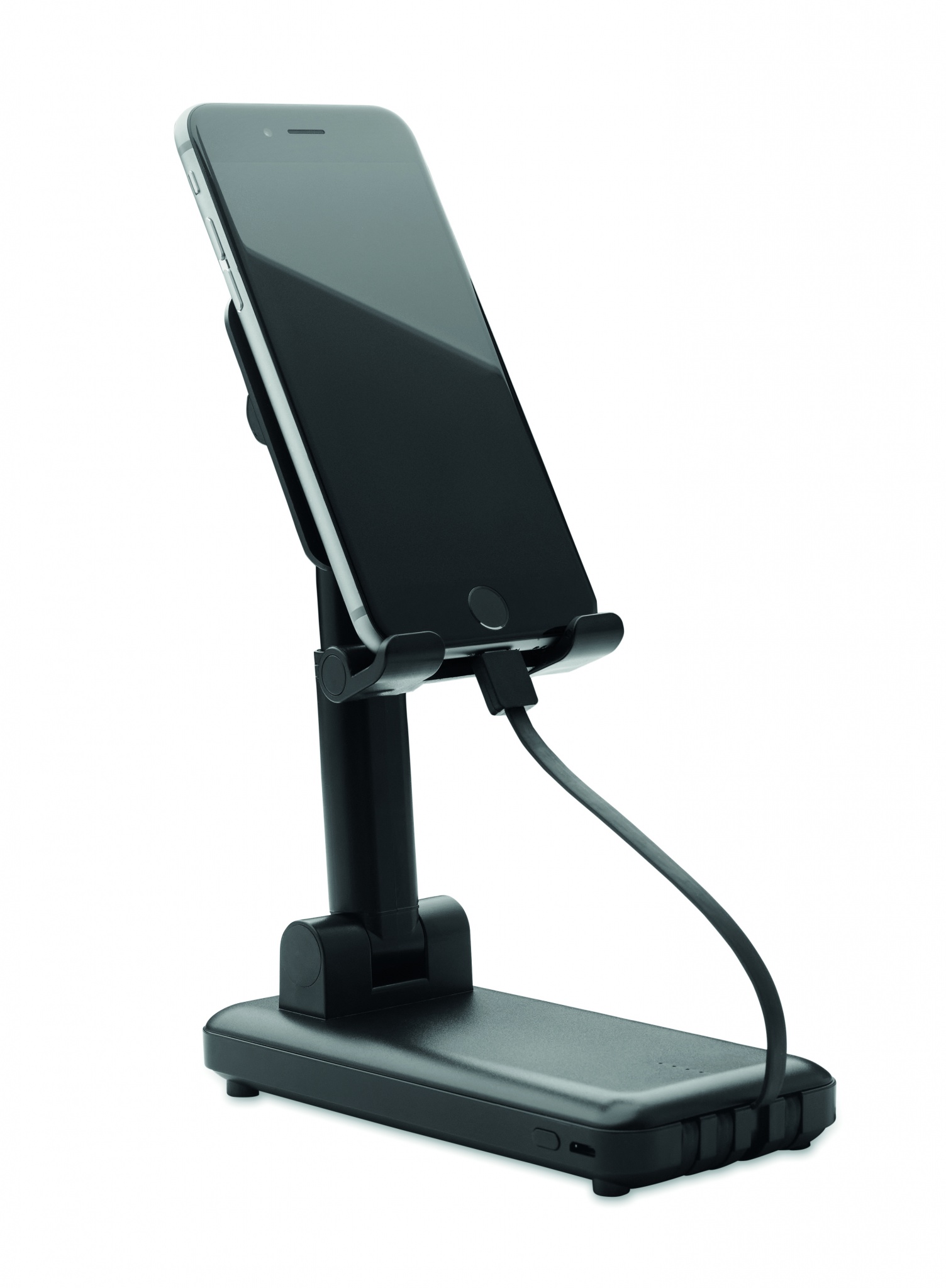 Power bank 10000 mAh in ABS with extendable and foldable phone holder. Integrated multi cables. Output: DC 5V/2A.