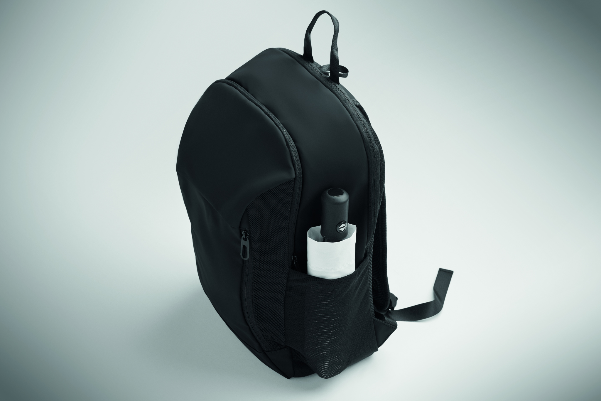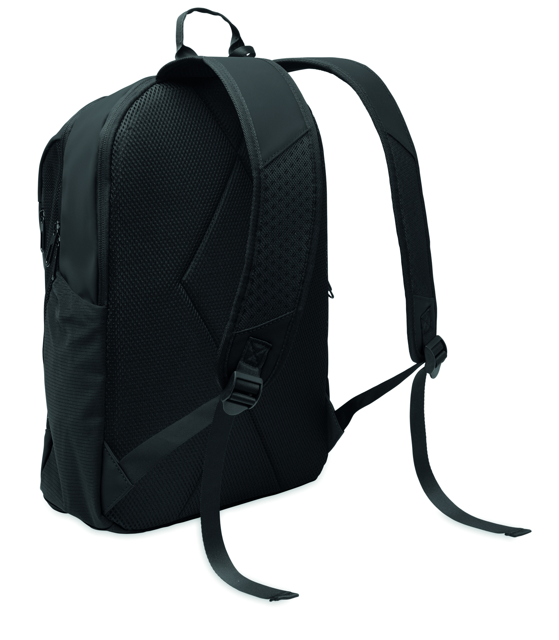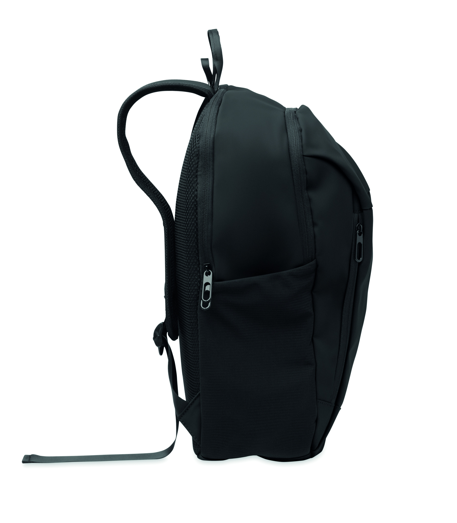 15 inch laptop backpack in soft PU with padded back and hidden zippered main compartment. 1 zippered front pocket, 2 front side zippered pockets and 2 elastic mesh side pockets. With 210D RPET lining.