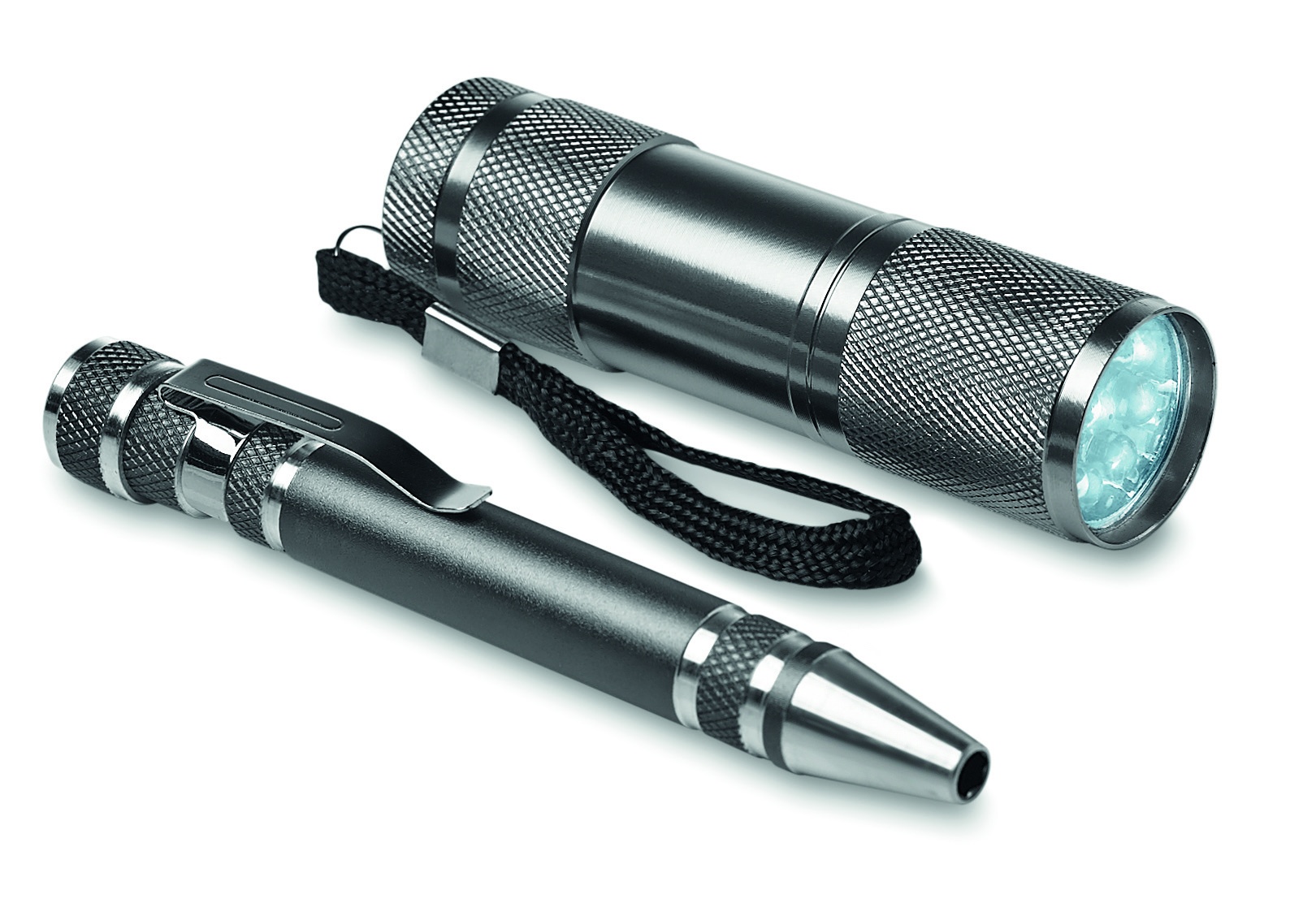 Tool set with 9 LED aluminium torch and aluminium multi tool in pen shape. Includes 3 slotted and 3 Phillips screwdriver heads. 3 AAA batteries excluded. Presented in box.