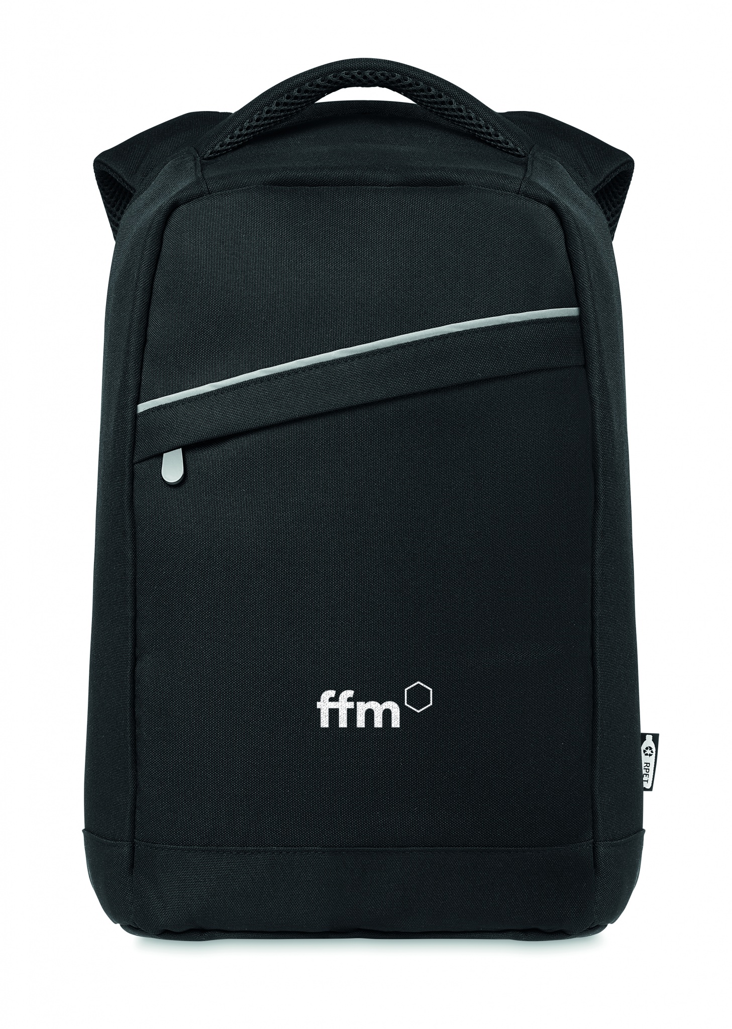 600D RPET backpack with padded shoulder strap with main internal compartment. It has a zippered front pocket. Includes one internal 13 inch laptop compartment. Zipper main compartment on backside for better security.
