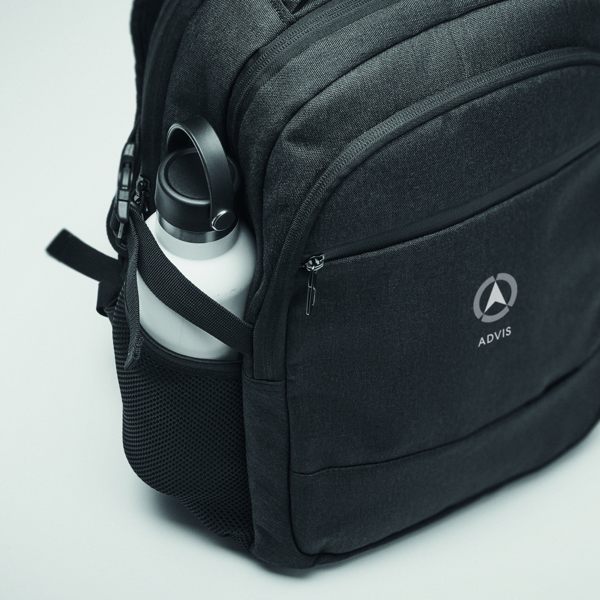 15 inch laptop backpack in 600D RPET polyester. 3 large zippered external compartments fully padded with several inside pockets. It has two mesh side pockets. Adjustable shoulder straps. Padded mesh airflow and trolley holder on reverse side.