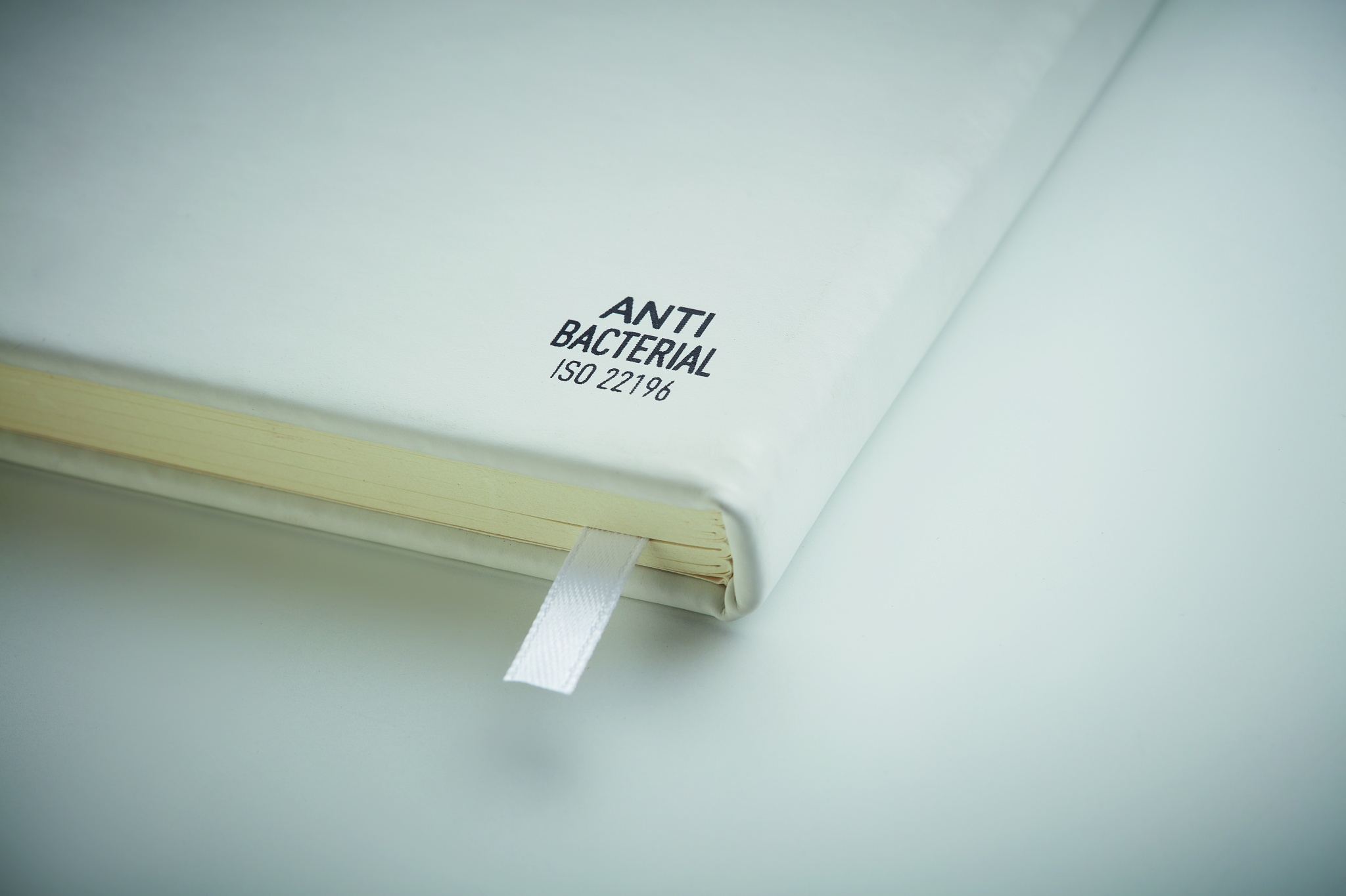A5 notebook with antibacterial hard PU cover with nano silver based active agents inhibiting and preventing the growth of at least 99% of bacteria. Casebound. 192 lined pages (96 sheets). Matching elastic closure strap and ribbon page-marker. Conforms ISO 22196.