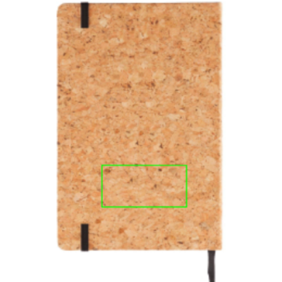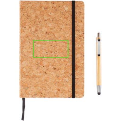 ECO notebook made out of natural cork with 160 pages of 80g/m2 paper. With black page divider and black elastic band. Including bamboo pen with stylus tip and ballpoint.