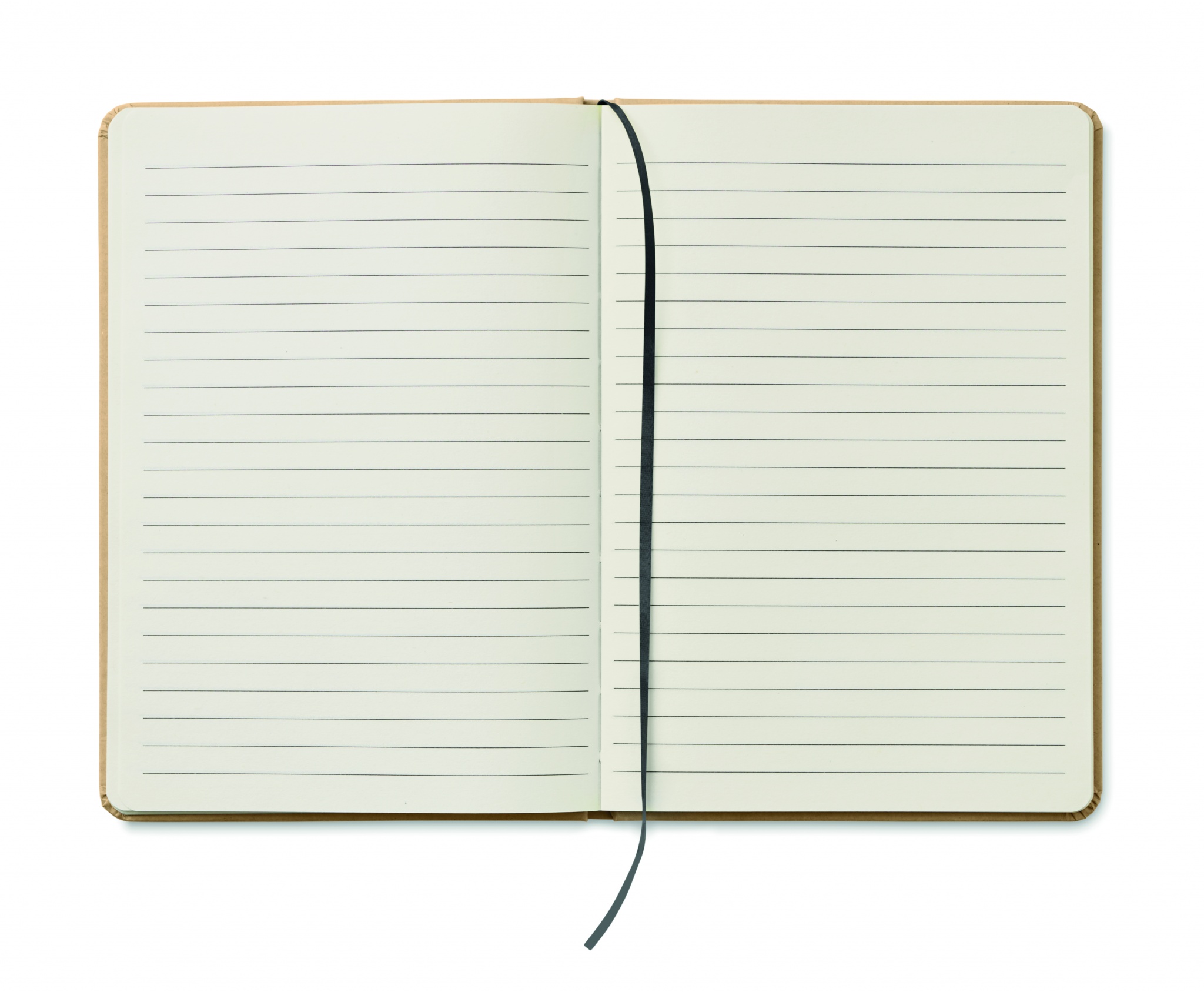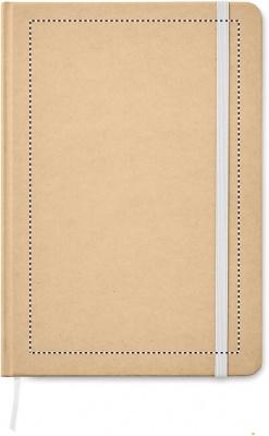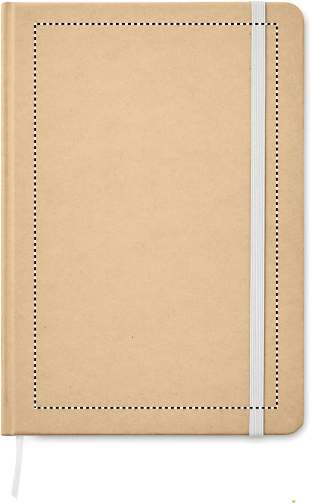 A5 notebook with hard recycled carton cover. Casebound. 160 lined pages (80 sheets). Elastic closure strap, ribbon bookmark.