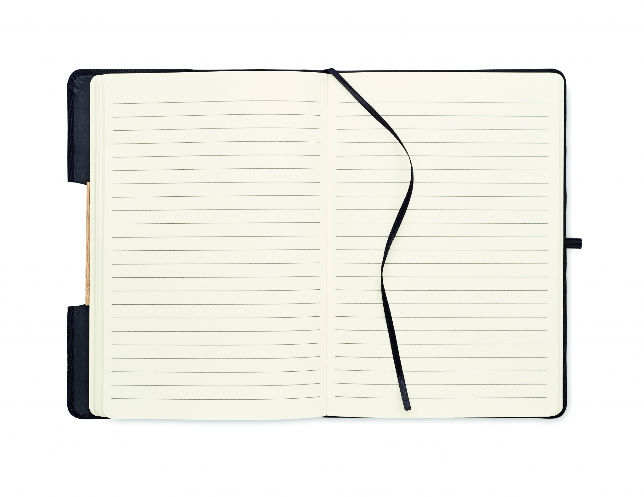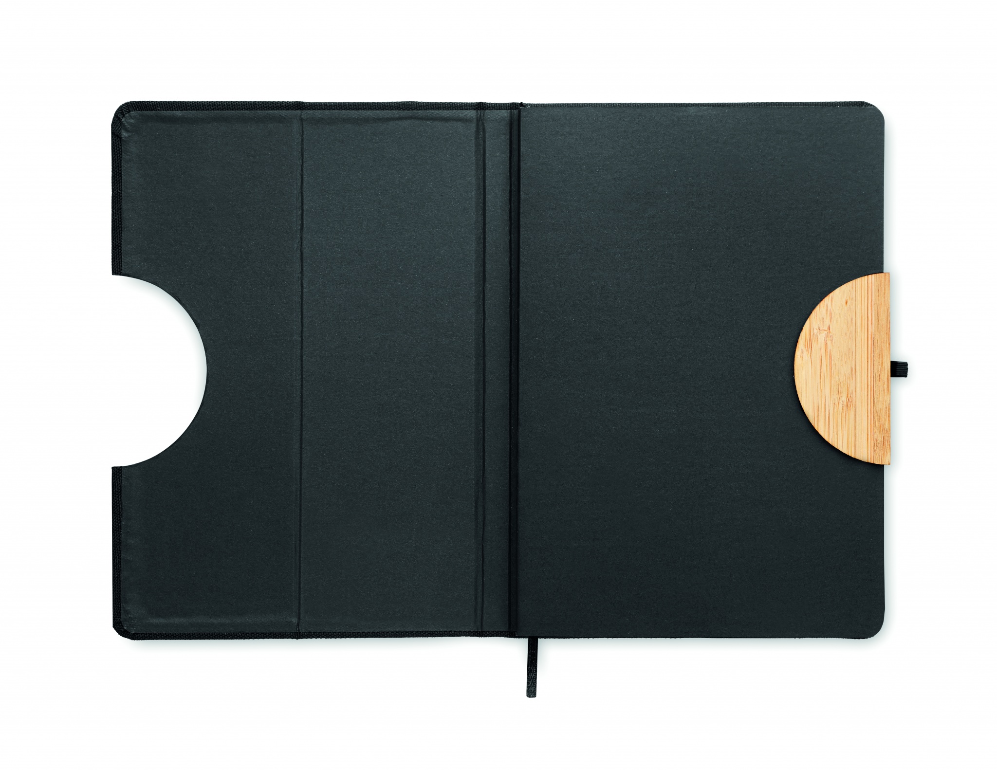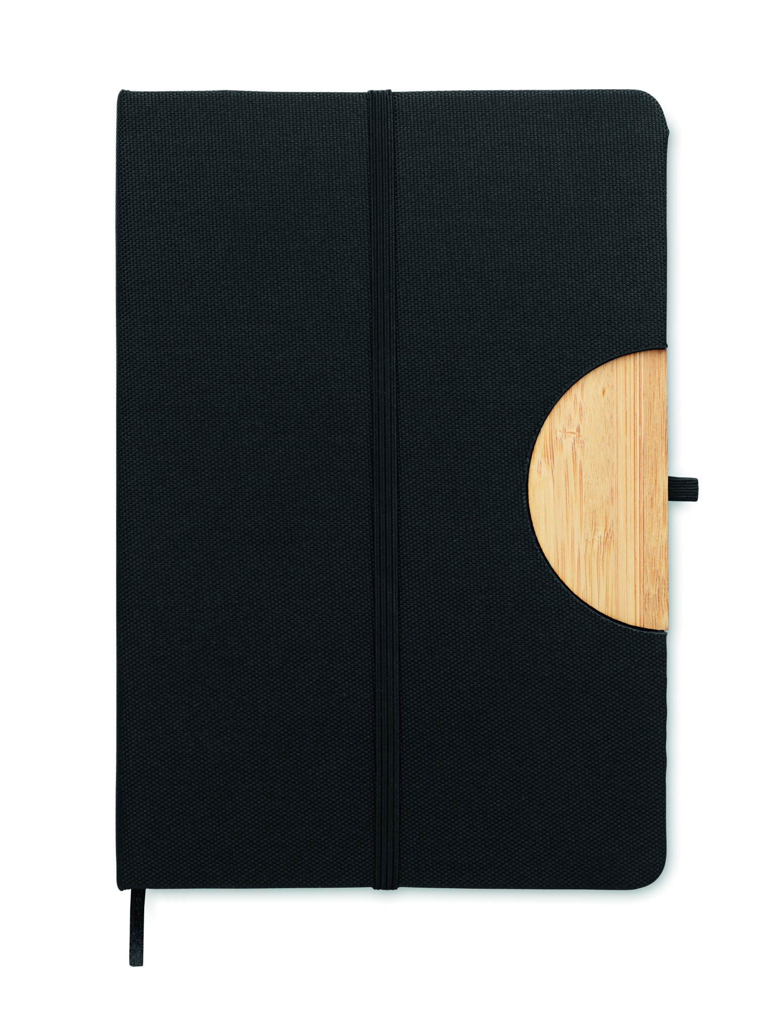 A5 notebook with 600D RPET hard cover with bamboo detail with a smartphone stand function. Casebound. 160 lined pages (80 sheets). 70 gsm recycled paper. Matching elastic closure strap, ribbon page-marker and pen holder. Bamboo is a natural product, there may be slight variations in colour and size per item, which can affect the final decoration outcome.