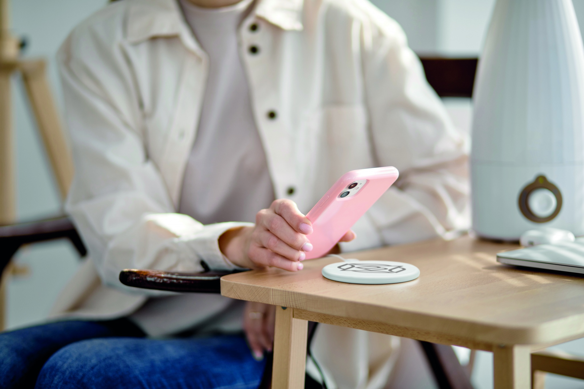 Recycled ABS wireless charger. Connect to your computer, place smartphone on device to commence charging. Output: DC 9V/1.1A (10W) for quick charging. Compatible latest androids, iPhone® 8, X and newer.