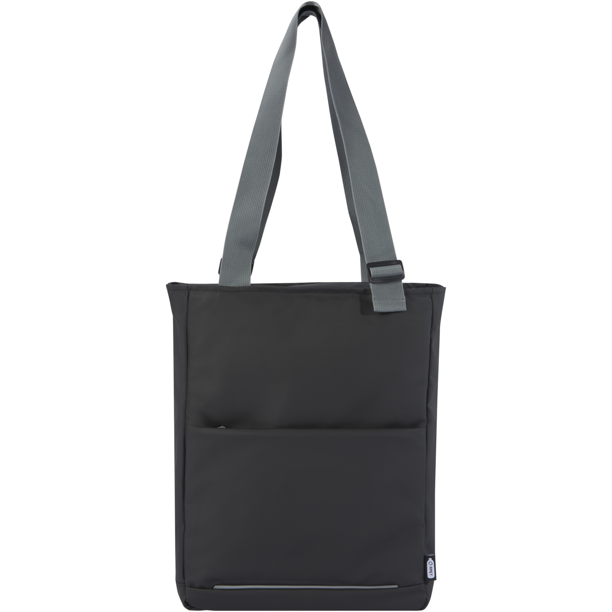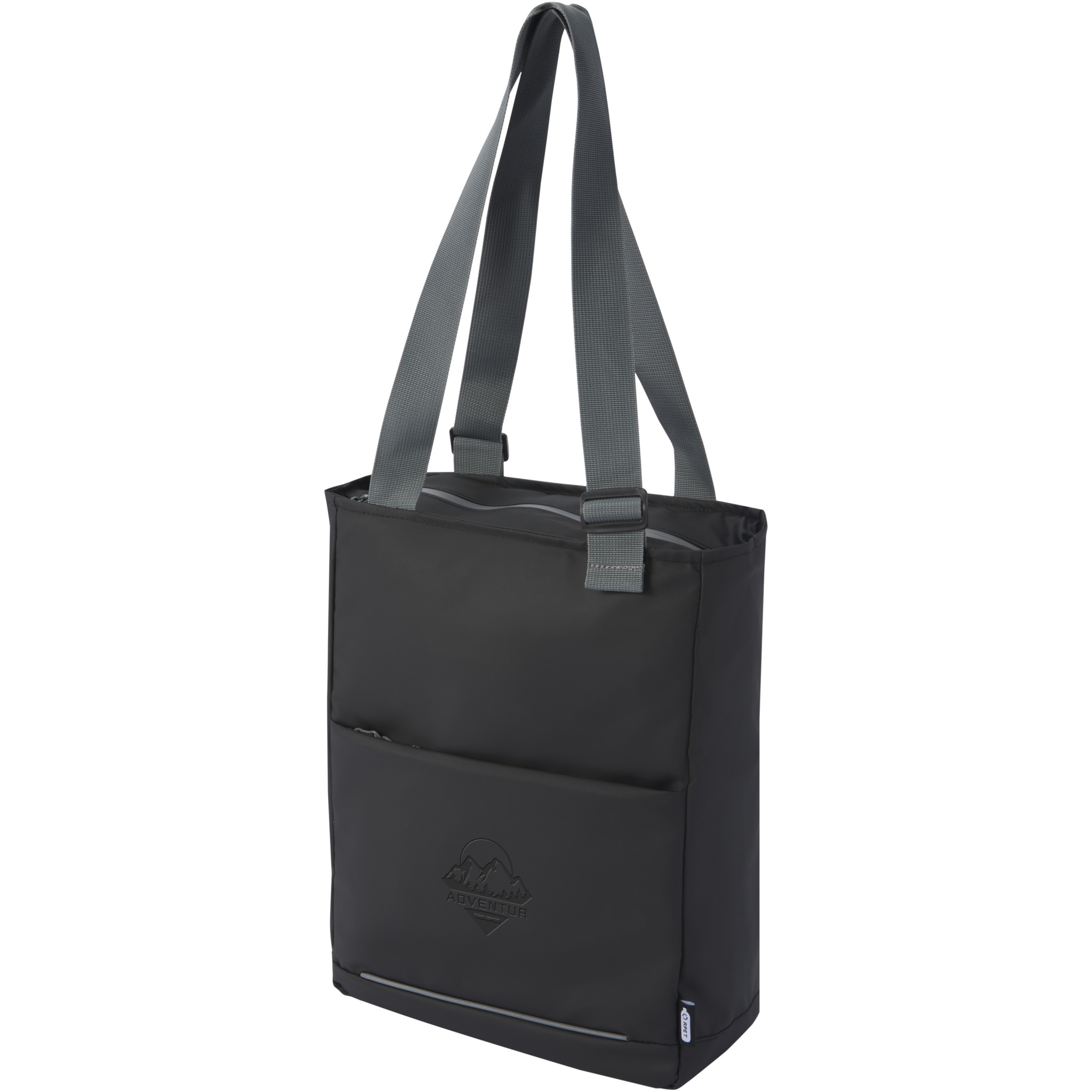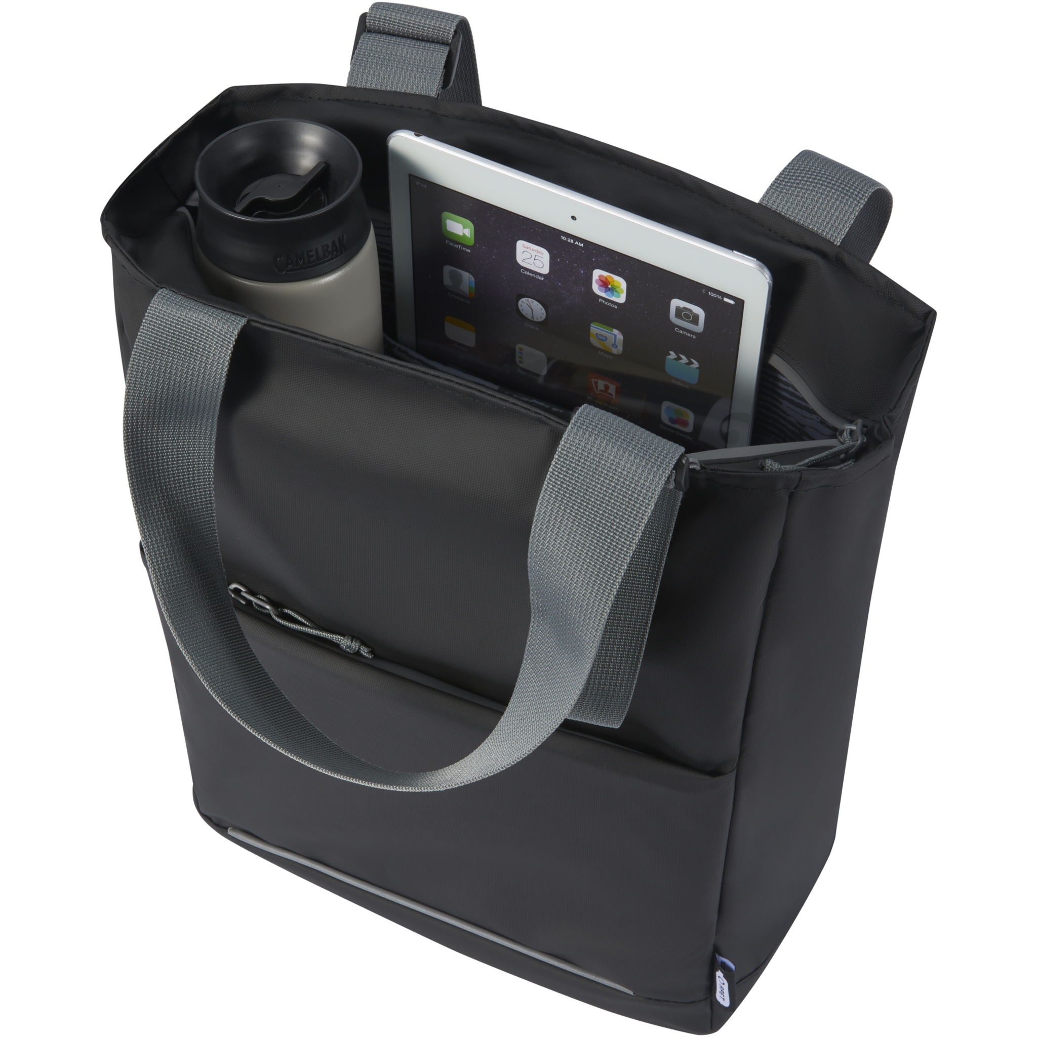 Water-resistant laptop tote bag made from GRS recycled materials, including the zips. It features a dedicated tablet sleeve, a 14” laptop compartment, multiple pockets for organization, a front pocket with organization panel, adjustable 35 cm long handles, and a luggage strap. The GRS recycled materials include the main fabric, lining, webbing, and zips. Capacity: 14 litres. PVC free.