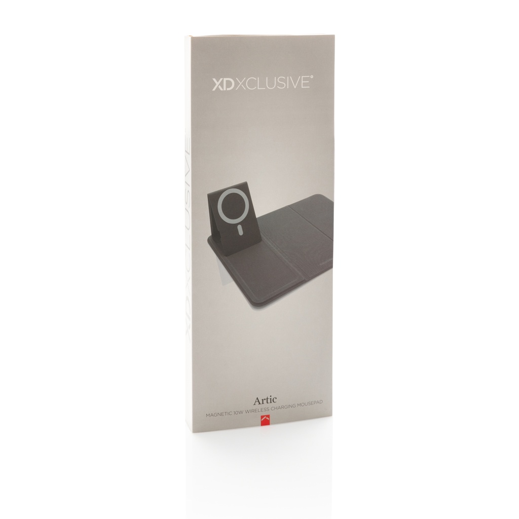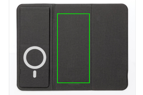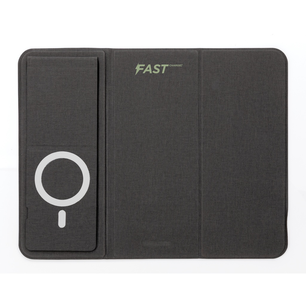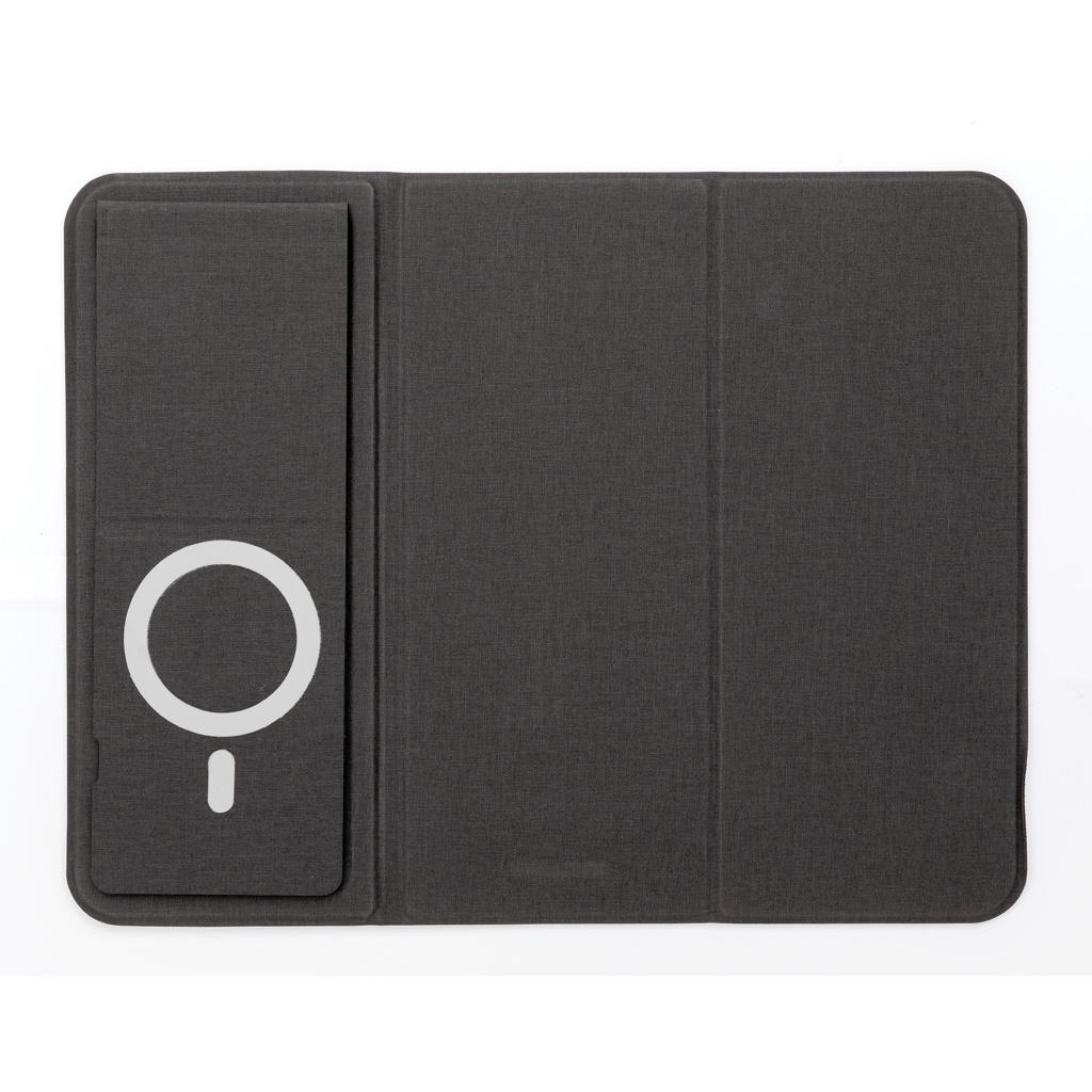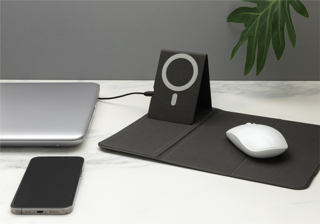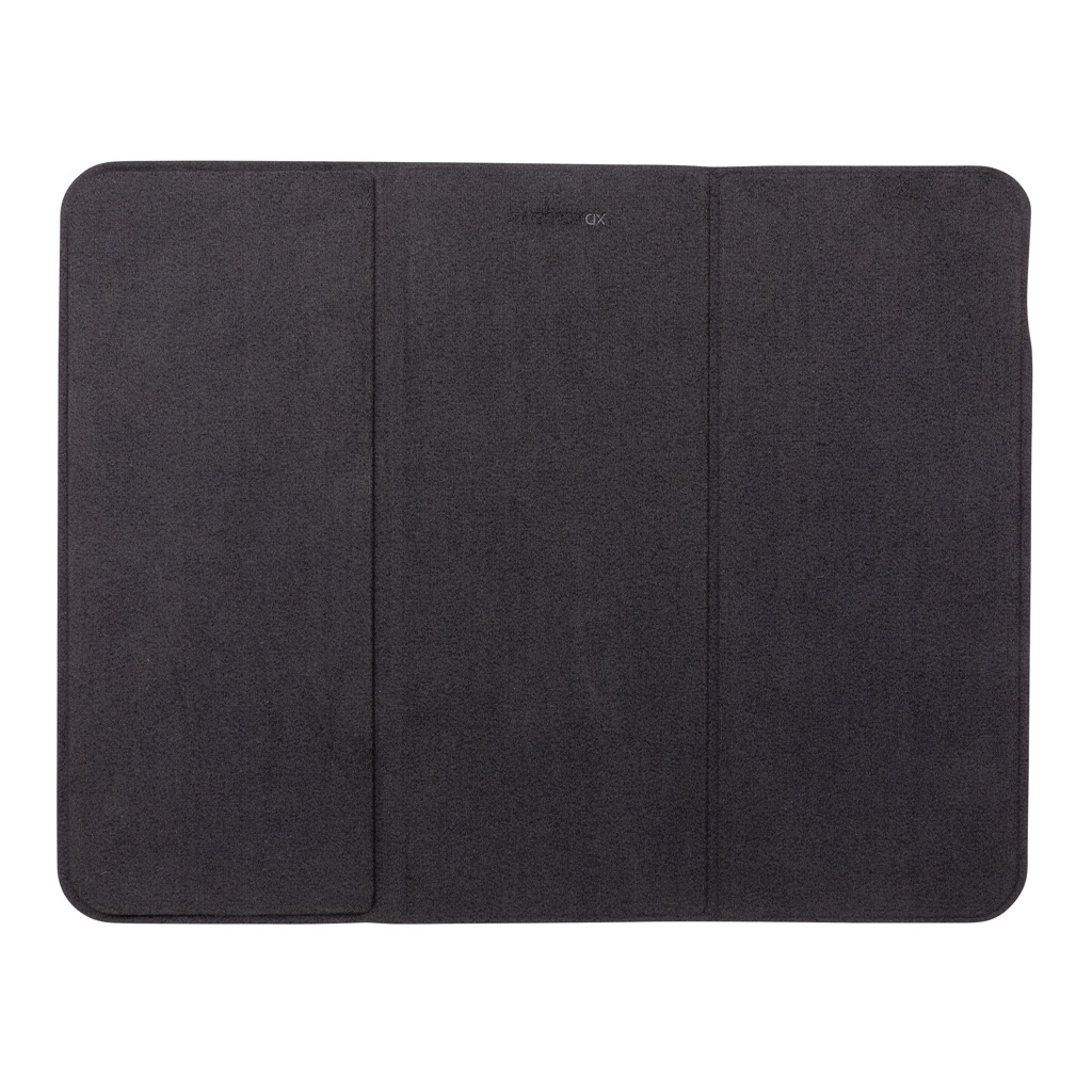 Flat and foldable 10W wireless charger mousepad. The PU material charger can be used both flat and as a stand. The whole mousepad can be folded so is easy to bring anywhere you go. The 10W wireless charger is compatible with all QI devices (Iphone 8 and up and Android devices) Type-C input 9V/2A; Wireless Output 9V/1.1A; Type-C output 9V/2A; Including PVC free TPE charging cable. 19 pcs high quality N52H heat resistant magnets integrated. Registered design. Including 120 cm PVC free TPE material type C cable. Registered design
