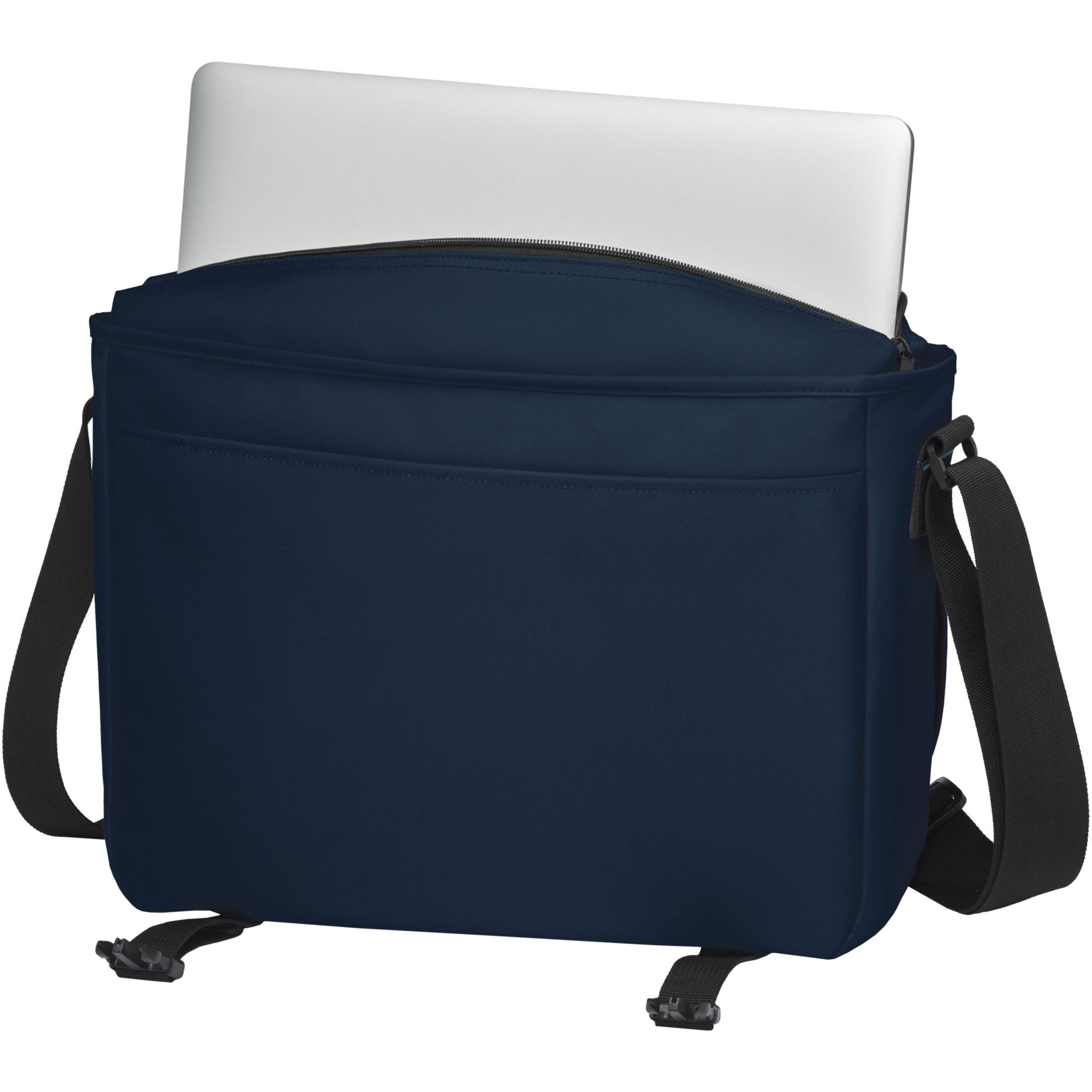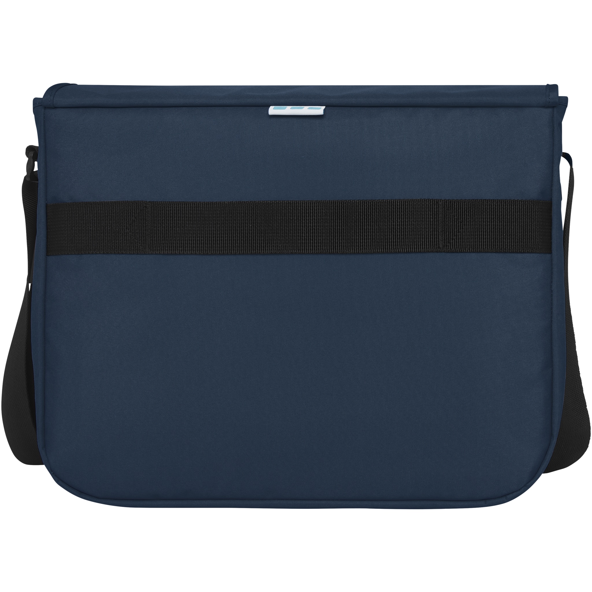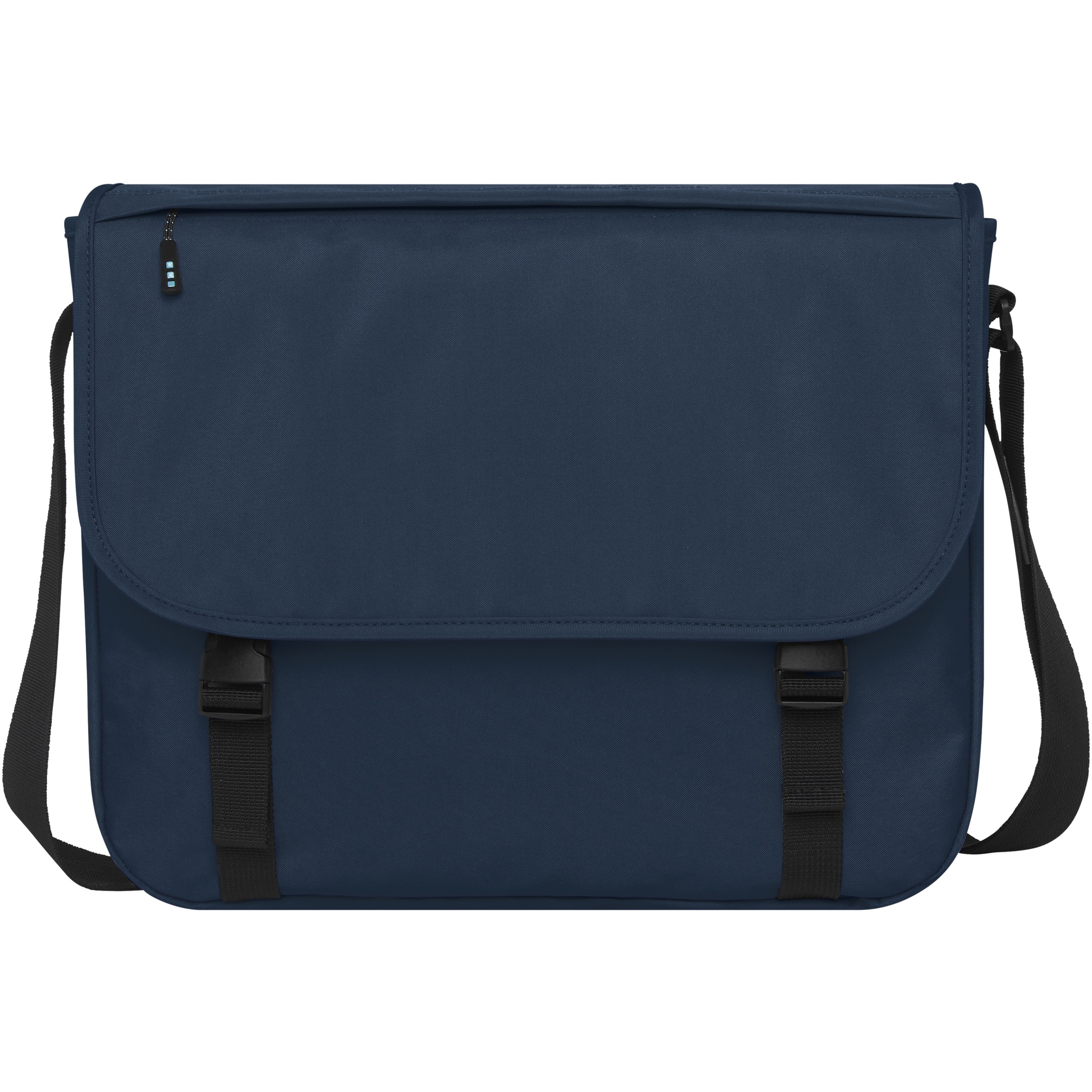 Sustainable GRS certified RPET laptop bag made with 60% recycled materials. Features a large zippered main compartment with a padded 15" laptop sleeve and a front compartment (both with velcro closures). Comes with a cover flap with a zippered pocket and with buckle closure. Features comfortable padded and adjustable shoulder strap and trolley tunnel on the backside.