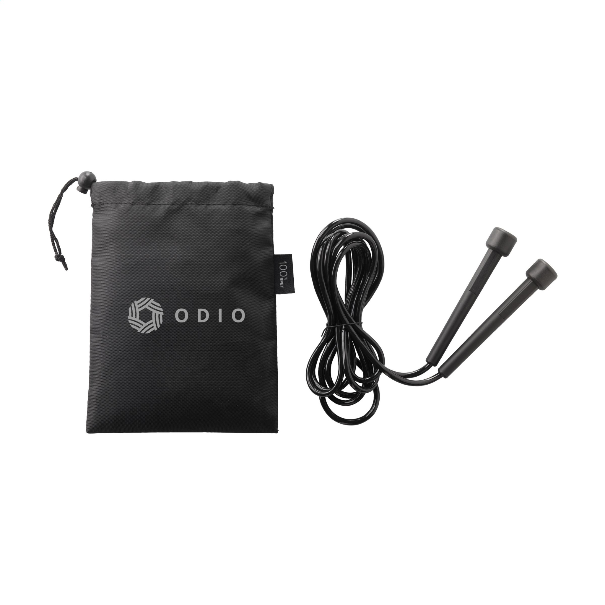 PVC sports jump rope. 270 cm in length with plastic handles. Supplied with a pouch made from 210D RPET material.