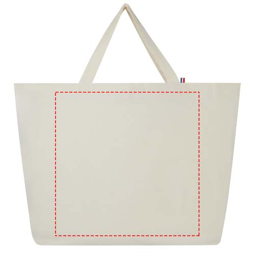 This large capacity tote bag is made with the finest, 100% recycled materials. It is constructed to use in everyday life, and suitable to carry around heavy books or groceries. The 200 g/m² recycled cotton/polyester blend ensures durability and reliability, giving the bag a resistance of up to 14kg weight. The yarns originate in Asia, but the weaving, spinning and manufacturing is all done in France.