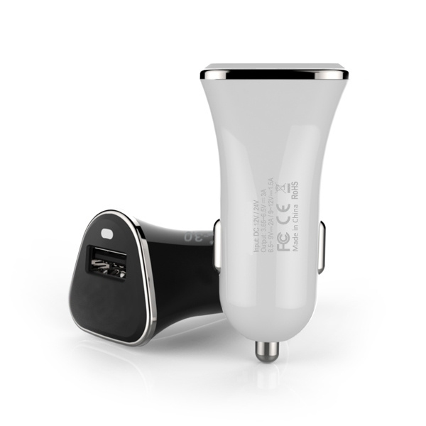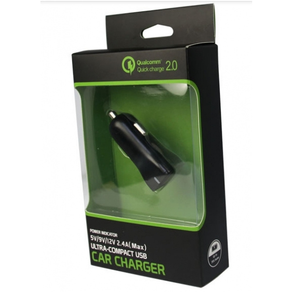 The perfect accessory for every car. You can easily charge all current smartphones and more with this USB charger. Just plug in into the cigarette lighter in your car. USB port can fast charge your smartphone thanks to Qualcomm Quick Charge QC3.0. Chip solutions:Qualcomm QC3.0 Input:12-24V Output:3.6V-6.5V/3A,or 6.5V-9V/2A,or 9V-12V/1.5A