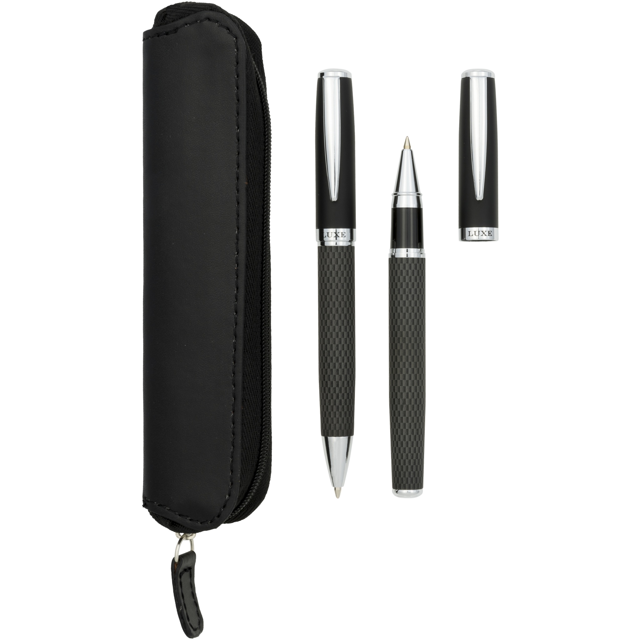 For a subtly different take on black, this exclusively designed pair of ballpoint and rollerball pens is finished in printed carbon fiber. Including quality protective pouch, packed in ''LUXE'' gift box.