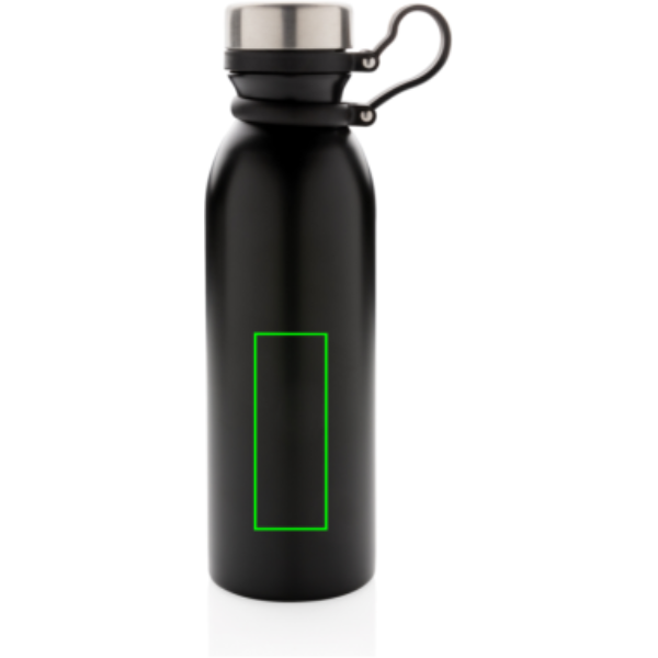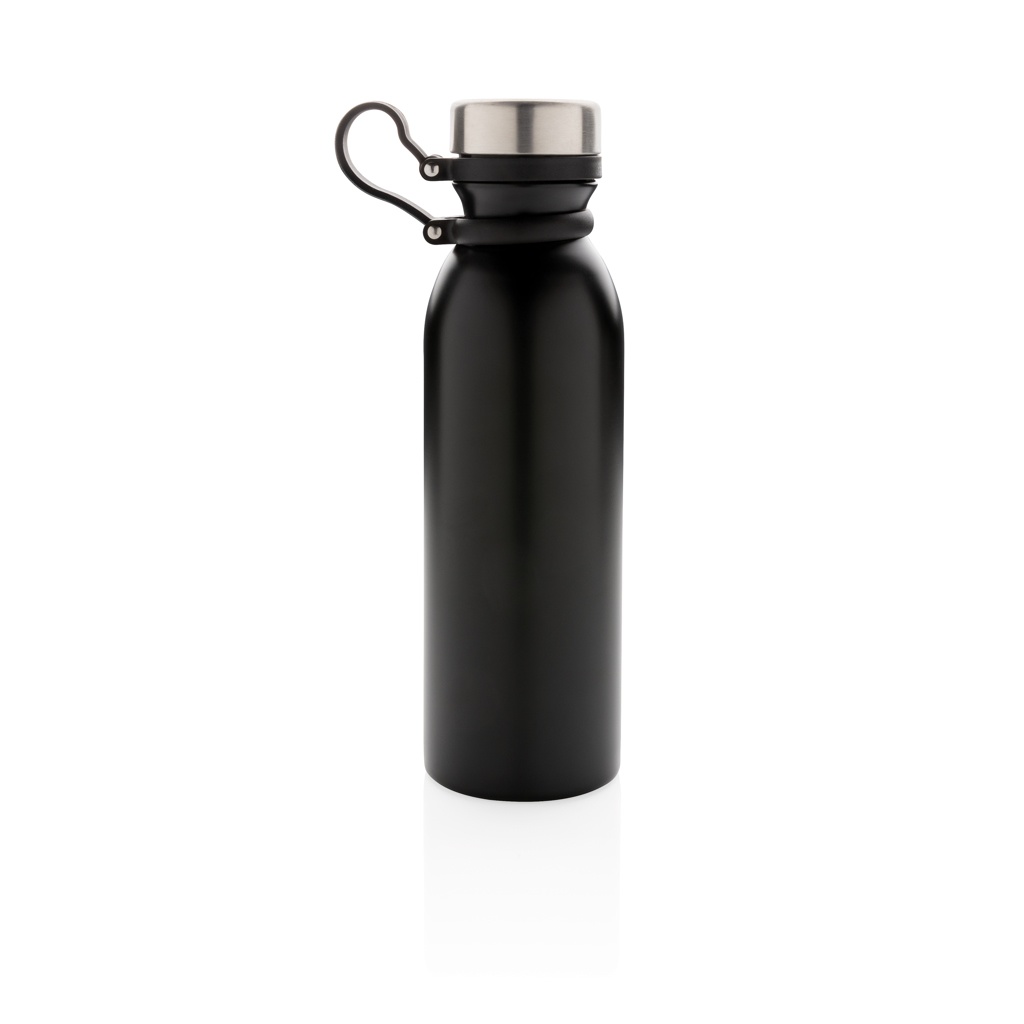 Leakproof copper vacuum insulated bottle with black silicone carry loop. One handed drinking means no need to store or carry the lid. Comes with a double-wall vacuum construction with copper insulation which means it keeps drinks hot for up to 8 hours and cold for up to 24 hours. The construction prevents condensation on the outside of the bottle. Content: 600 ml.