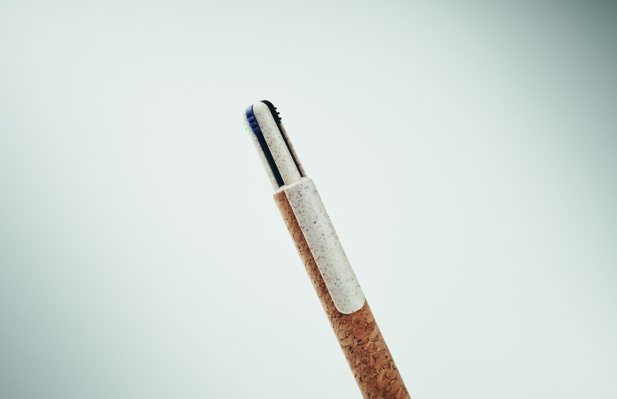 Push button 4-colour ink ball pen with cork barrel and wheat straw (50%) and ABS plastic (50%) fittings.