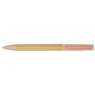 Bamboo ballpoint pen that also functions as a phone holder. The button and mid ring are made of recycled plastic, the tip is made of brass, and the barrel is made of responsibly sourced bamboo. Ink colour: Black. Writing length: 1000 metres. Nib size: 1.0 mm.