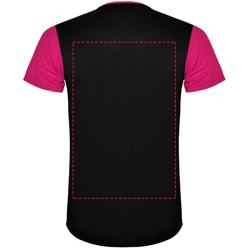 Easy-dry, technical and breathable fabric. Crew neck. Combination of two polyester fabrics on the back and shoulders. Bird's eye fabric on front and breathable 3D mesh fabric at the back. Fabric prepared for moisture absorption. Decorative zigzag backstitch on sides and shoulders. Back pattern slightly longer. Removable label.