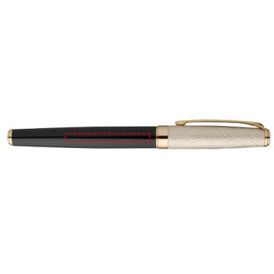 A luxurious rollerball pen, with gold leather cap and lacquered golden parts, delivered in a Luxe gift box. Lower barrel is made out of brass with lacquer and upper barrel out of brass and PU. Rollerbal pen: 14 cm x 1.15 cm, weight: 32 gr, writing length: 500 m.