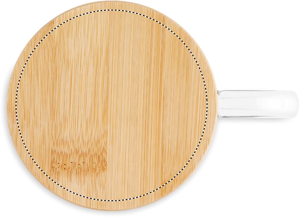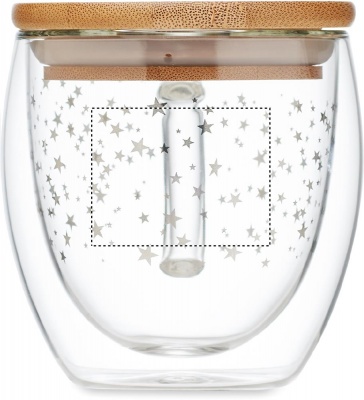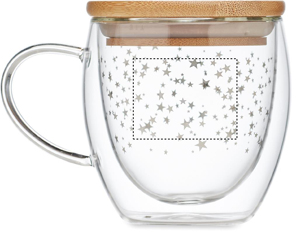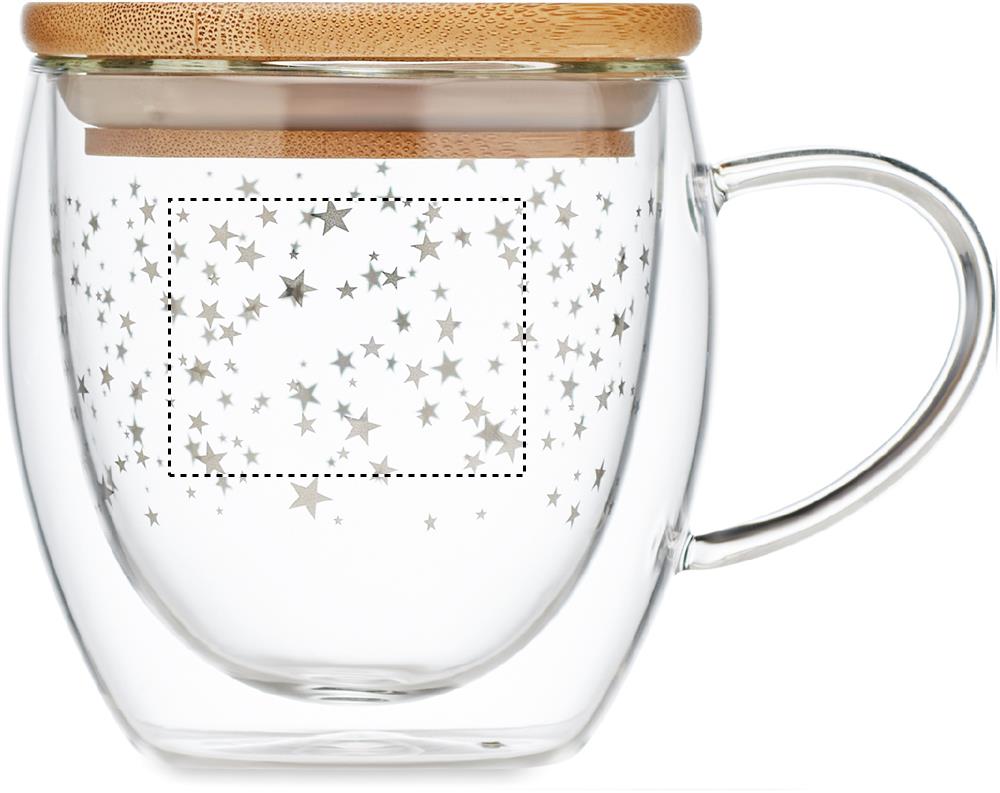 Double wall borosilicate mug with stars design and bamboo lid. Capacity: 220 ml. Bamboo is a natural product, there may be slight variations in colour and size per item, which can affect the final decoration outcome.