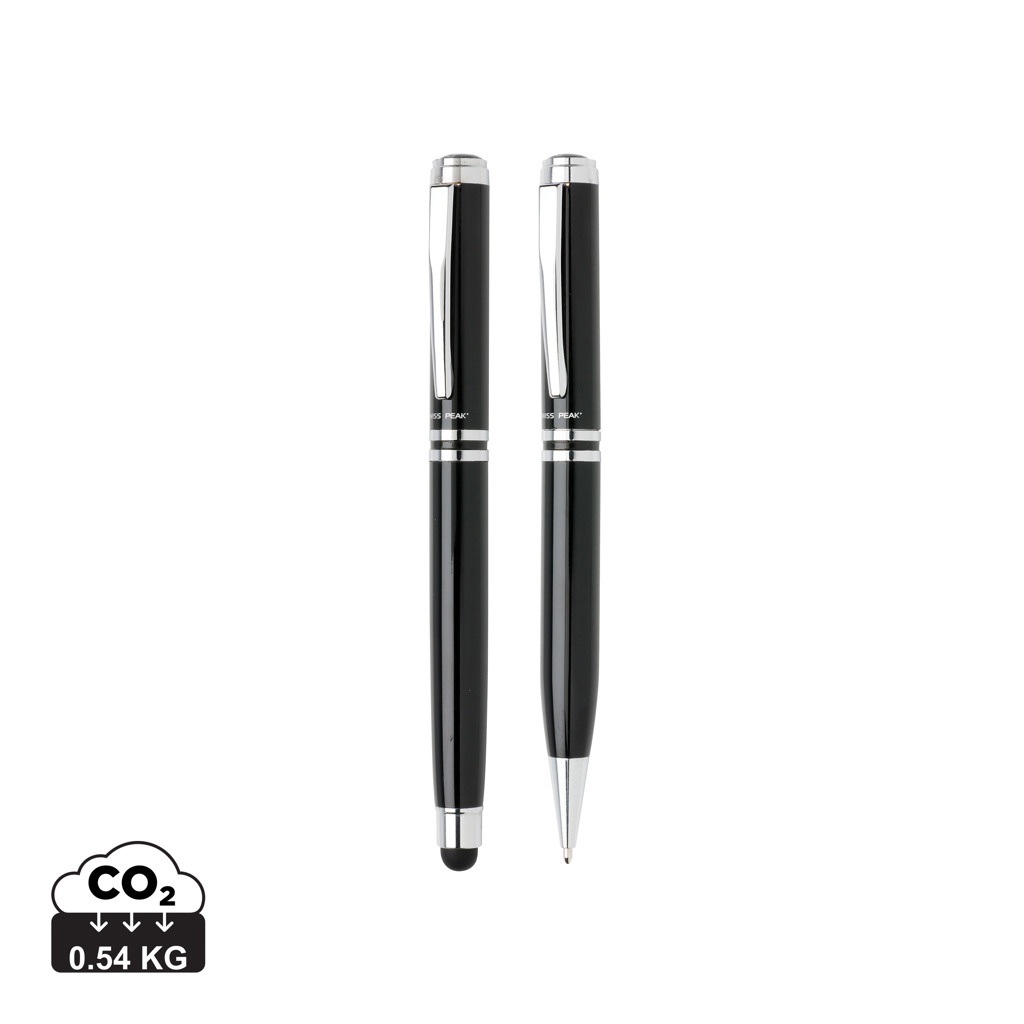 Authentic pen set bearing all the hallmarks of classic quality. High quality heavy brass metal rollerball with stylus and ball point pen with Swiss Peak branding. Including premium PU leather pouch and giftbox. Blue ink.