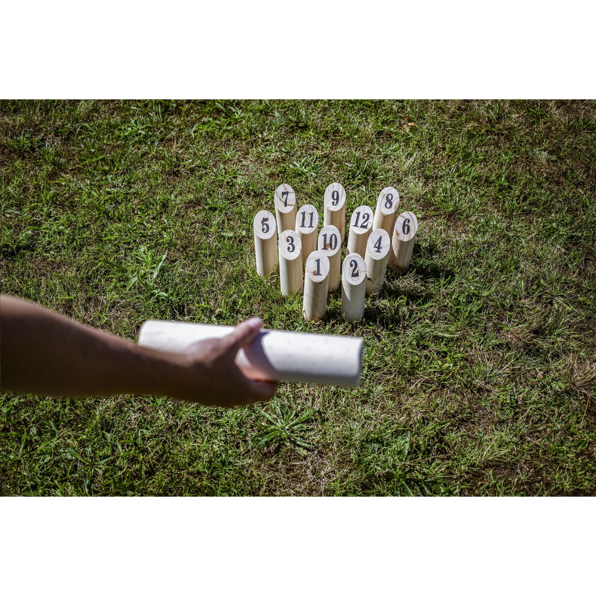 Wooden throwing game, also known as Finnish skittles. Who will be the first to reach the required 50 points? This Finnish outdoor party game requires skill, precision and strategy. Fun to play at a campsite or on the beach. Suitable for players both young and old. The 13-piece set comes in a cotton bag. Incl. instructions. Each item is supplied in an individual brown cardboard box.