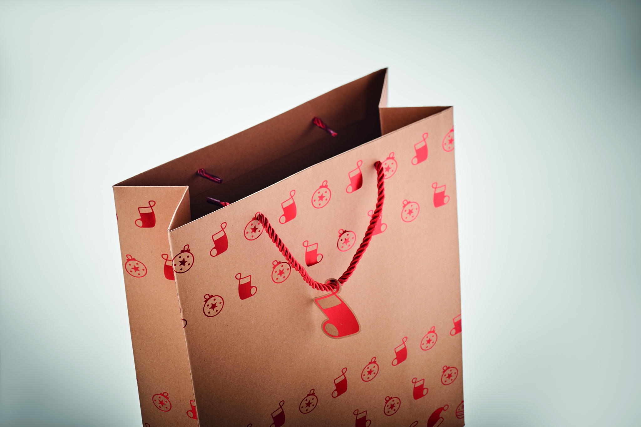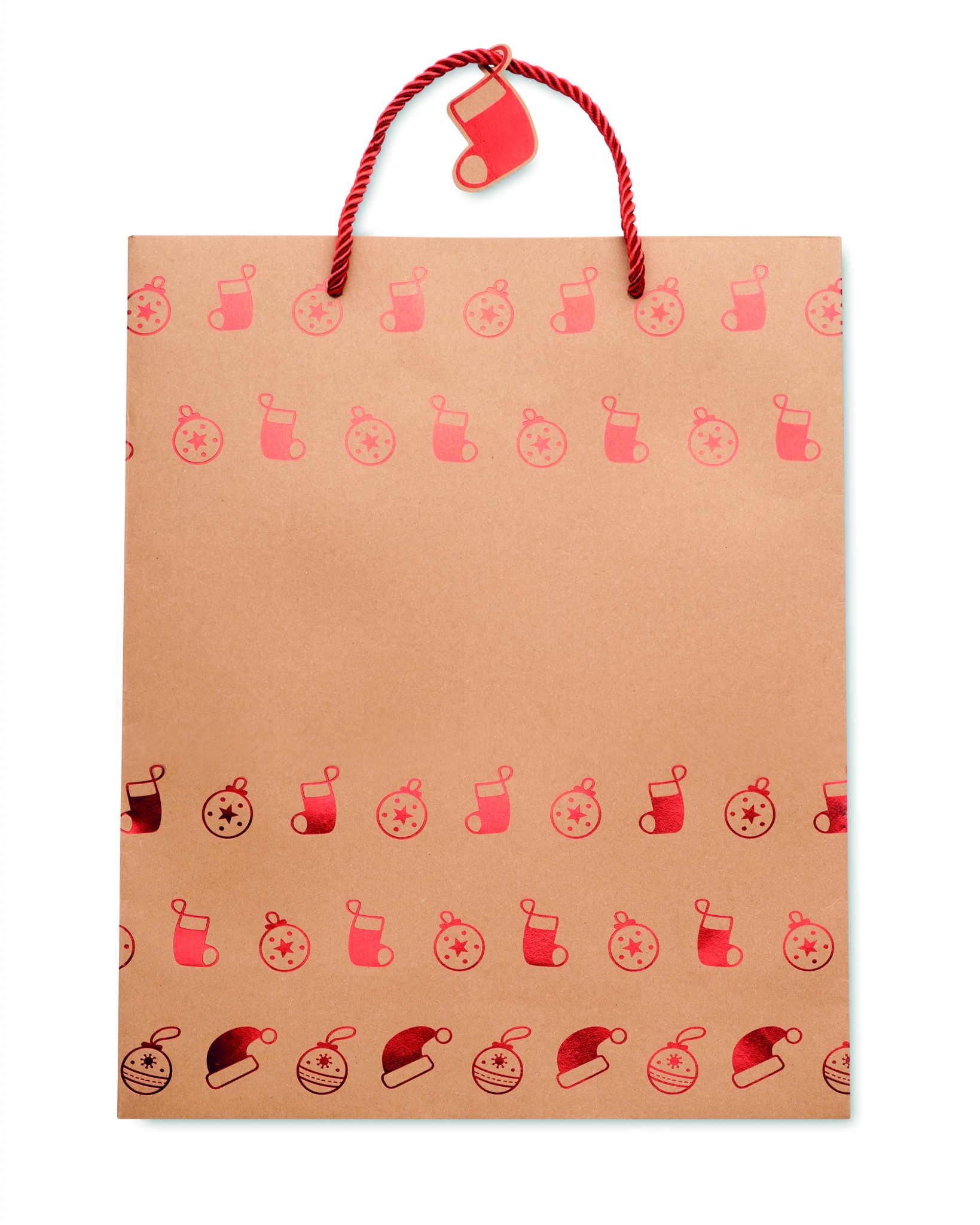 Elegant gift kraft paper bag with seasonal pattern. Gift tag included. 250 gr/m².