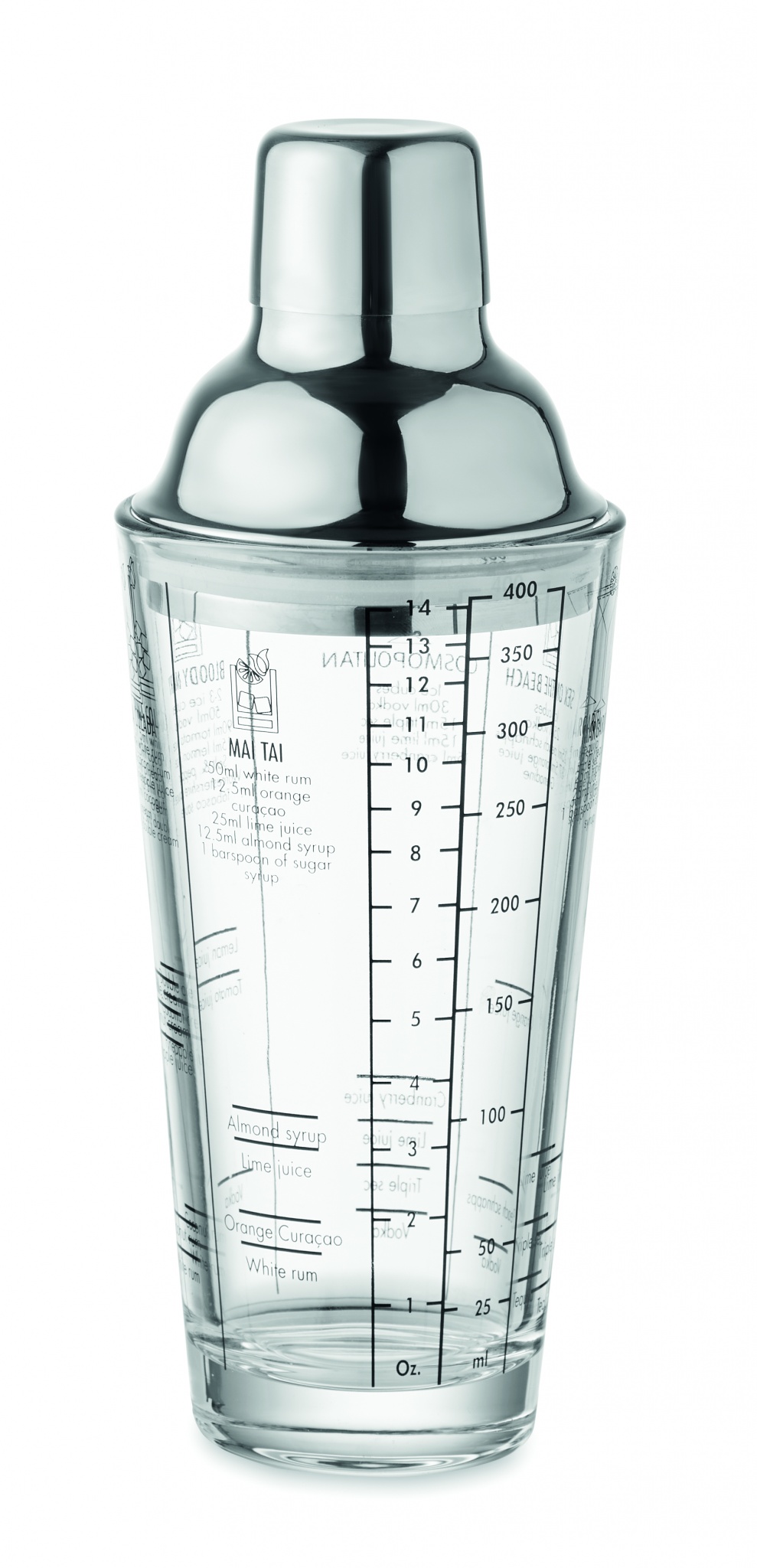Glass cocktail shaker with stainless steel lid with strainer. Printed cocktail recipes and measurements on the glass. Capacity: 400 ml.