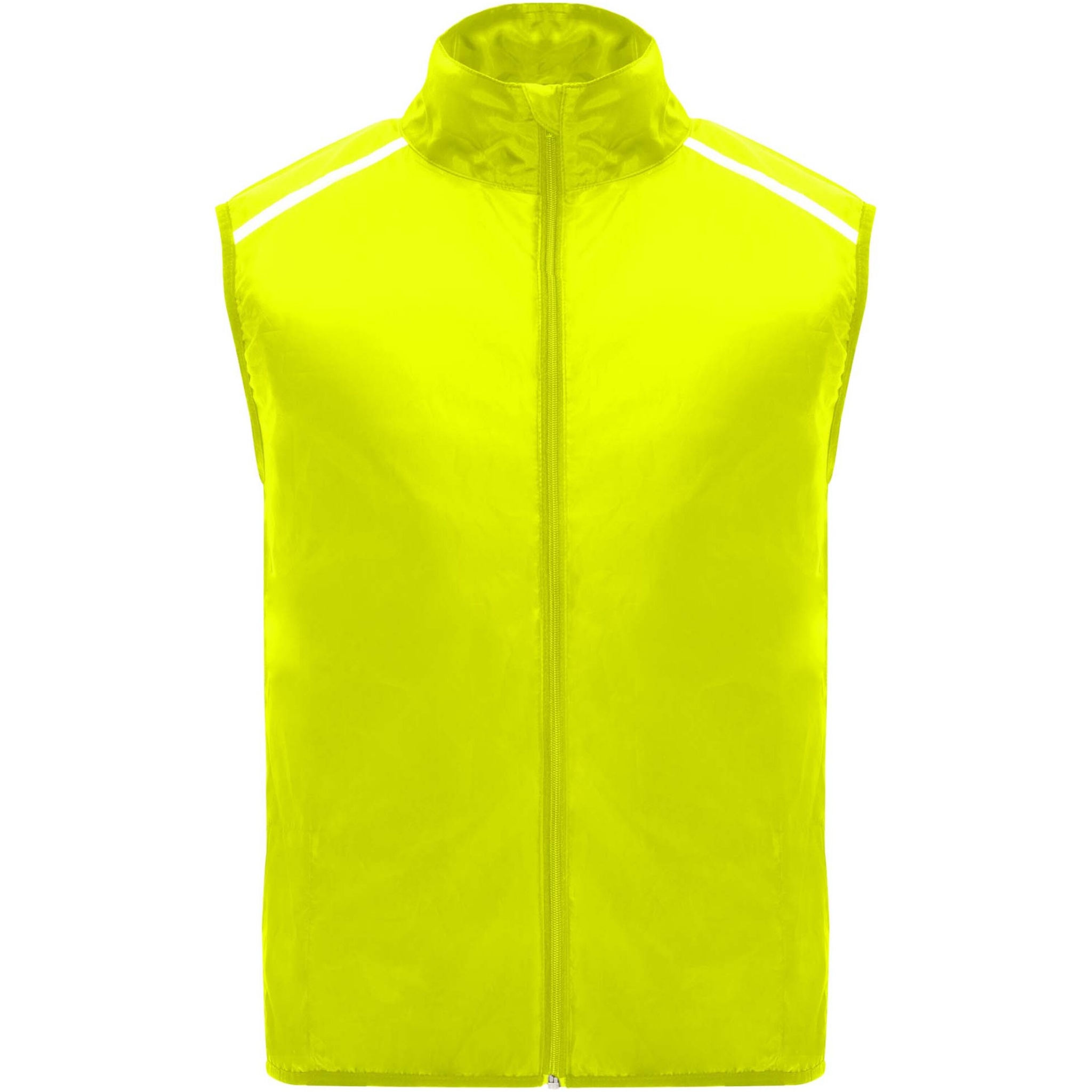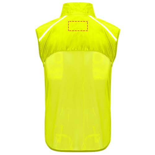 Wind-proof and breathable. Front zip with matching chin protector. Elastic binding at armhole and bottom. Bottom part of the back in microperforated fabric. High-visibility details on the top, front and back. Pocket with elastic strap to stow the vest and wear it on the wrist. Removable label.