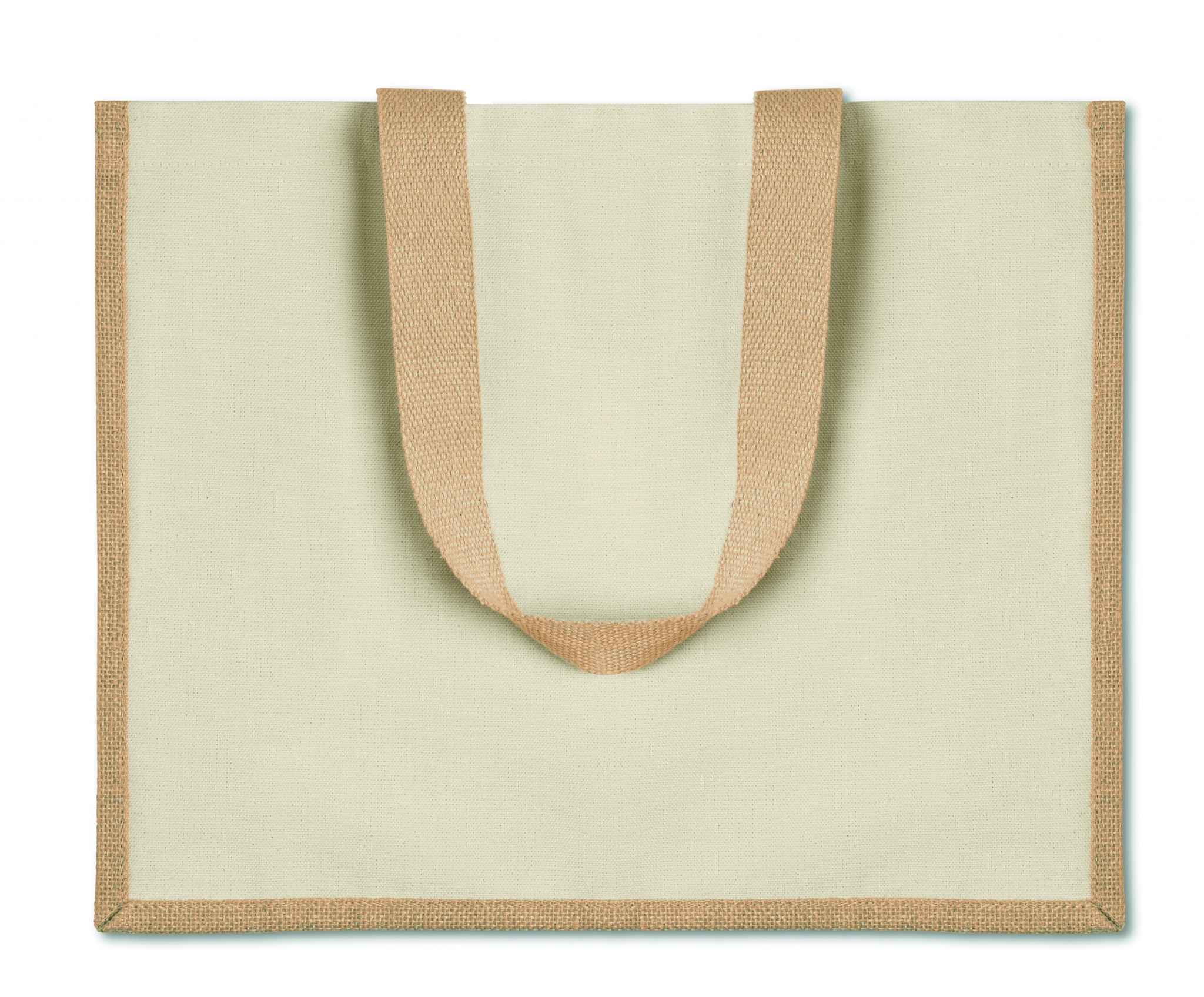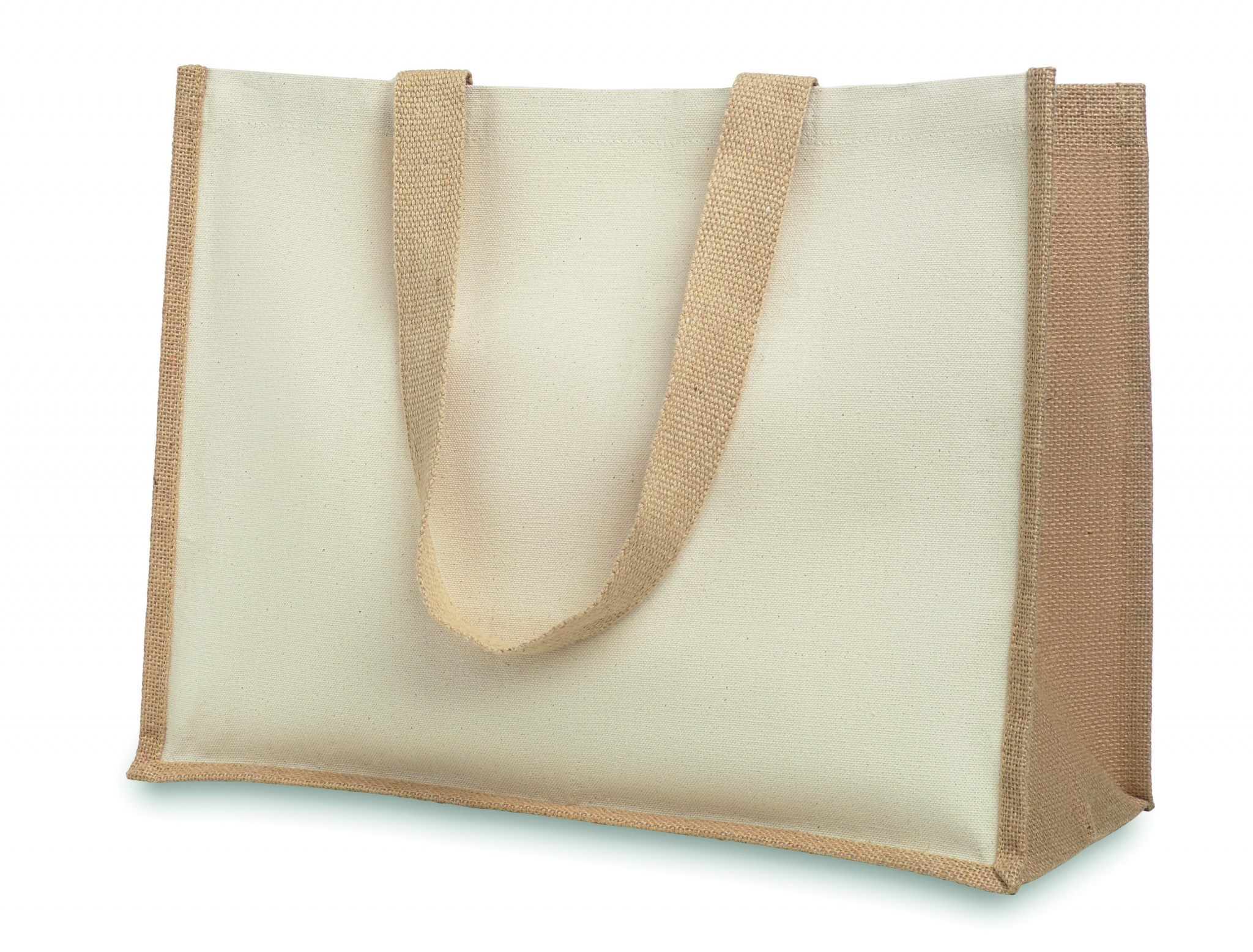 Jute shopping bag laminated with front in canvas and cotton webbing. Long handles.