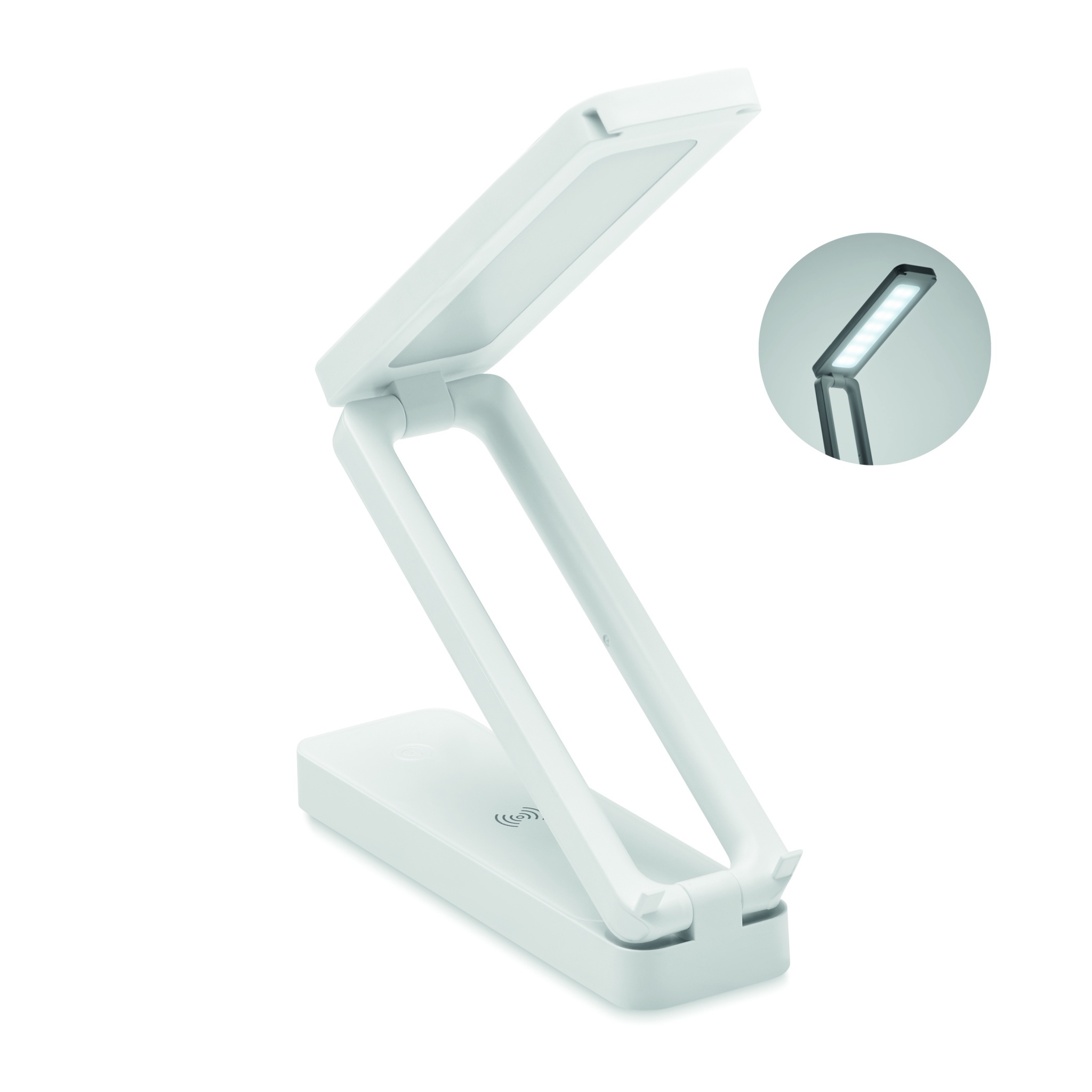 ABS foldable desktop lamp with 14 LED lights which has 3 brightness settings, a 10W wireless charger. Output: DC 9V/1.1A (10W) for quick charging. Compatible with latest Androids, iPhone® 8 and newer.