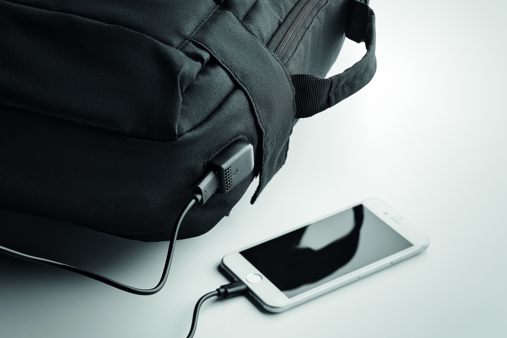 Laptop backpack in 300D RPET Polyester with padded shoulder strap including one main internal compartment for 16 inch laptop and a USB charging cable.