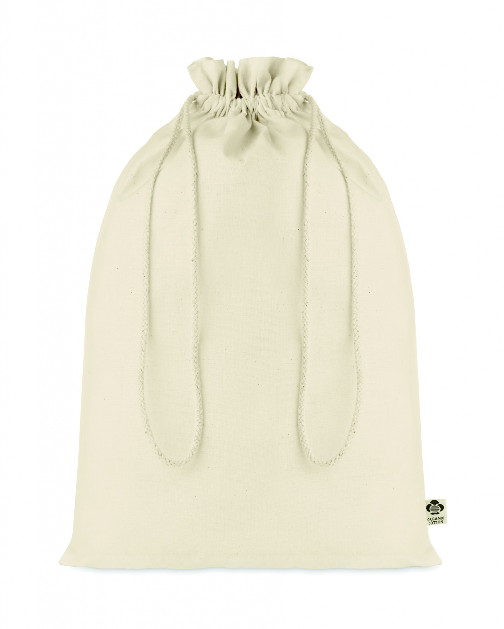 Large gift draw cord bag in organic cotton. Size approx. 30 x 47 cm. 105 gr/m².