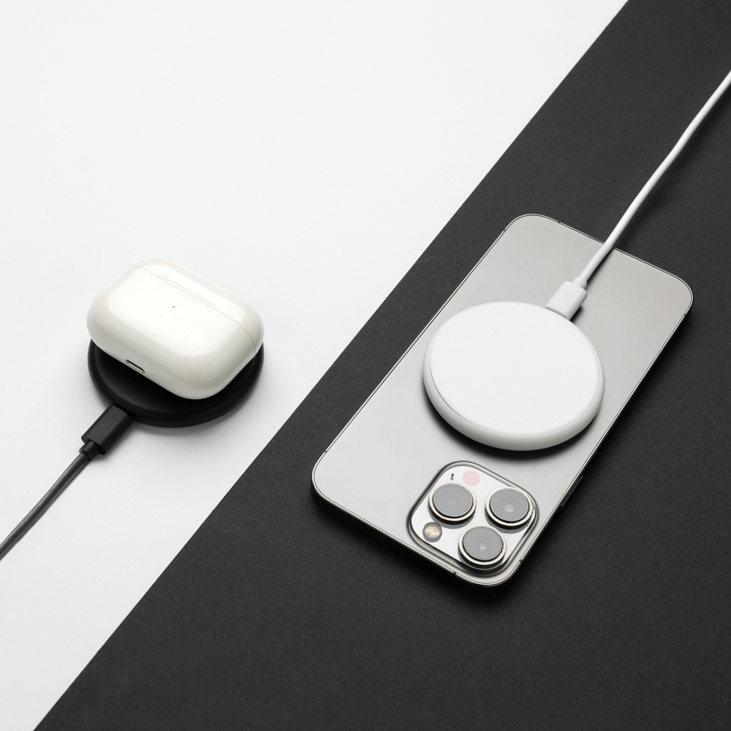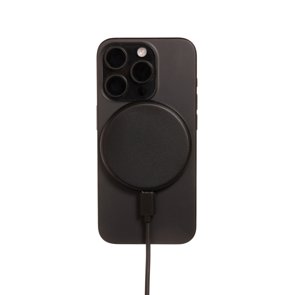 Unique design 15W magnetic wireless charger that gives you the option to charge either your mobile device, earbuds or iWatch. Simply click them on and start charging. Made with recycled ABS and recycled TPE. Total recycled content: 35% based on total item weight. RCS certification ensures a completely certified supply chain of the recycled materials. Including 120 cm USB A to USB C charging cable made from RCS certified recycled TPE. Packed in FSC® packaging. PVC Free. Output 9V.2.2A Output watch: 9V/0.4A, Output earbuds: 9V/0.5A. Input 9V/3A.