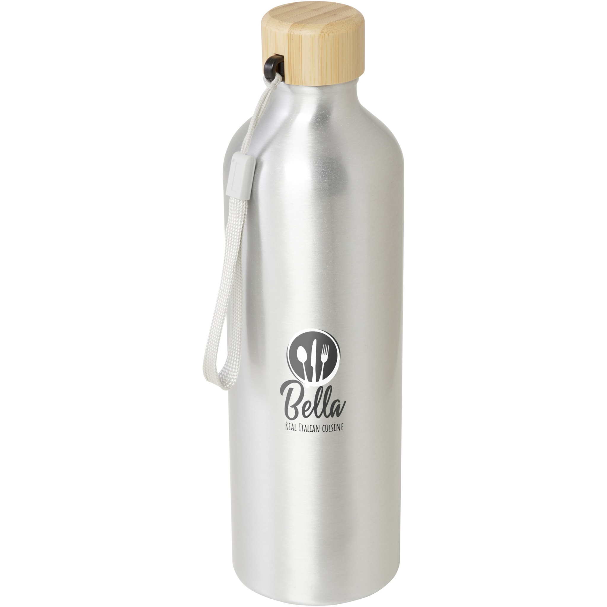 RCS certified recycled aluminium water bottle with a stylish bamboo lid. This lightweight, single-walled bottle comes with a strap for easy carrying. The bamboo is from sustainable, environmentally and socially responsible sources. Capacity is 770 ml. Hand wash only.