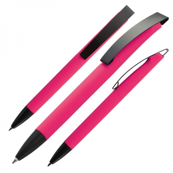 Plastic ballpen with rubber finish and blue-writing refill. We engrave your logo on the metal clip.