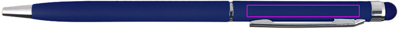 Stainless steel ballpen with blue-writing plastic refill and color-matched touch function above the clip. We will engrave your logo below the clip.