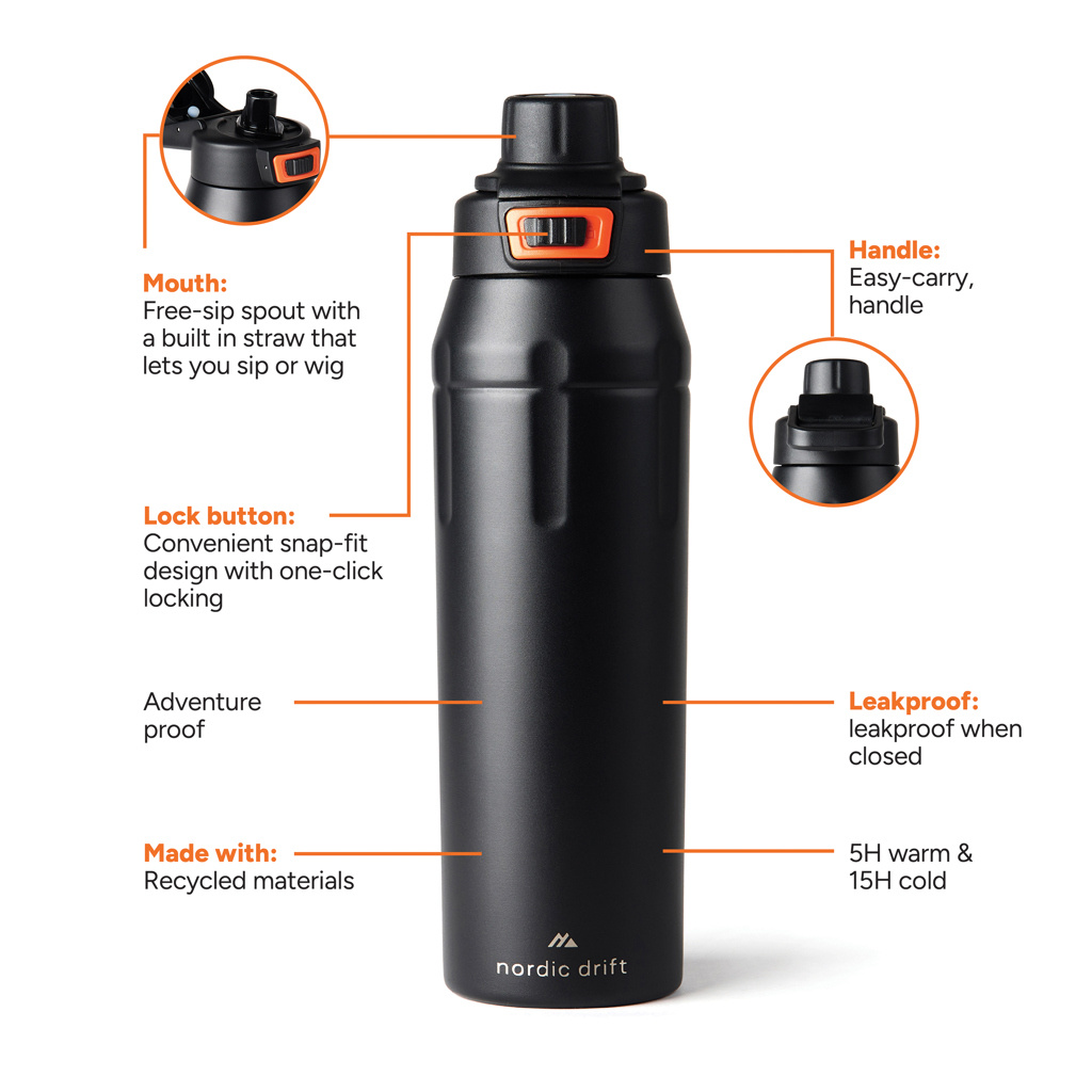 Built to Last, Made to Explore.Meet the Nordic Drift Recycled Steel Bottle, crafted from 79% RCS-certified recycled stainless steel. Designed for adventure with 750ML capacity, it features a durable powder-coated body, carry handle, and lockable lid to keep your drink secure. The innovative lid offers two drinking options: simply twist from the spout to the sip function for easy, on-the-go hydration. Leakproof and built for both outdoor adventures and daily use, this bottle combines practicality with sustainability. Comes with FSC giftbox.All Nordic Drift products are tested for quality. Because we strongly trust the performance and durability of our gear, every item comes with a 5-year warranty on manufacturing defects.