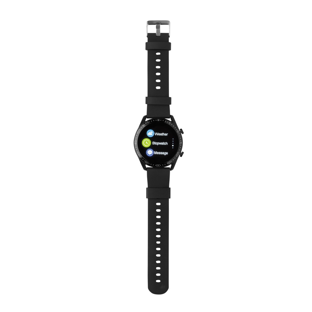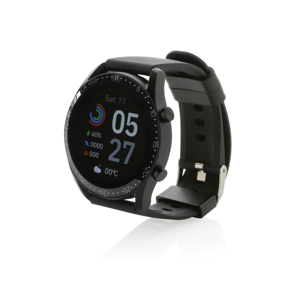 Modern lifestyle watch with 1.28” round full touch screen to track your activities all day long. With integrated MIC to answer phone calls on the watch. Made with RCS (Recycled Claim Standard) certified recycled TPU armband and metal frame. Total recycled content: 22% based on total item weight. RCS certification ensures a completely certified supply chain of the recycled materials. Features include: Step count, calories, distance, multi-sport tracking, alarm clock, heart rate tracking, blood pressure monitoring, sleep monitor, calendar updates, make and receive calls, notifications: SMS, Facebook, Skype, WhatsApp, Twitter etc. Compatible with Android 4.4 and IOS 8.0 and above.. BT 4.0. Standby time of 15 days and working time up to 5 days. Including clip charger to charge the watch. Packed in FSC® mix kraft packaging. Item and accessories 100% PVC free.