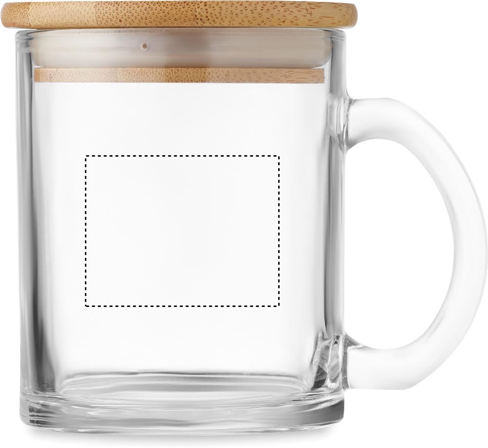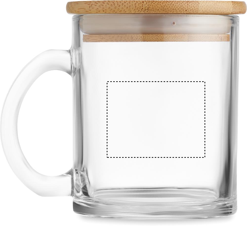 Recycled glass mug with bamboo lid. Capacity: 300 ml. Bamboo is a natural product, there may be slight variations in colour and size per item, which can affect the final decoration outcome.