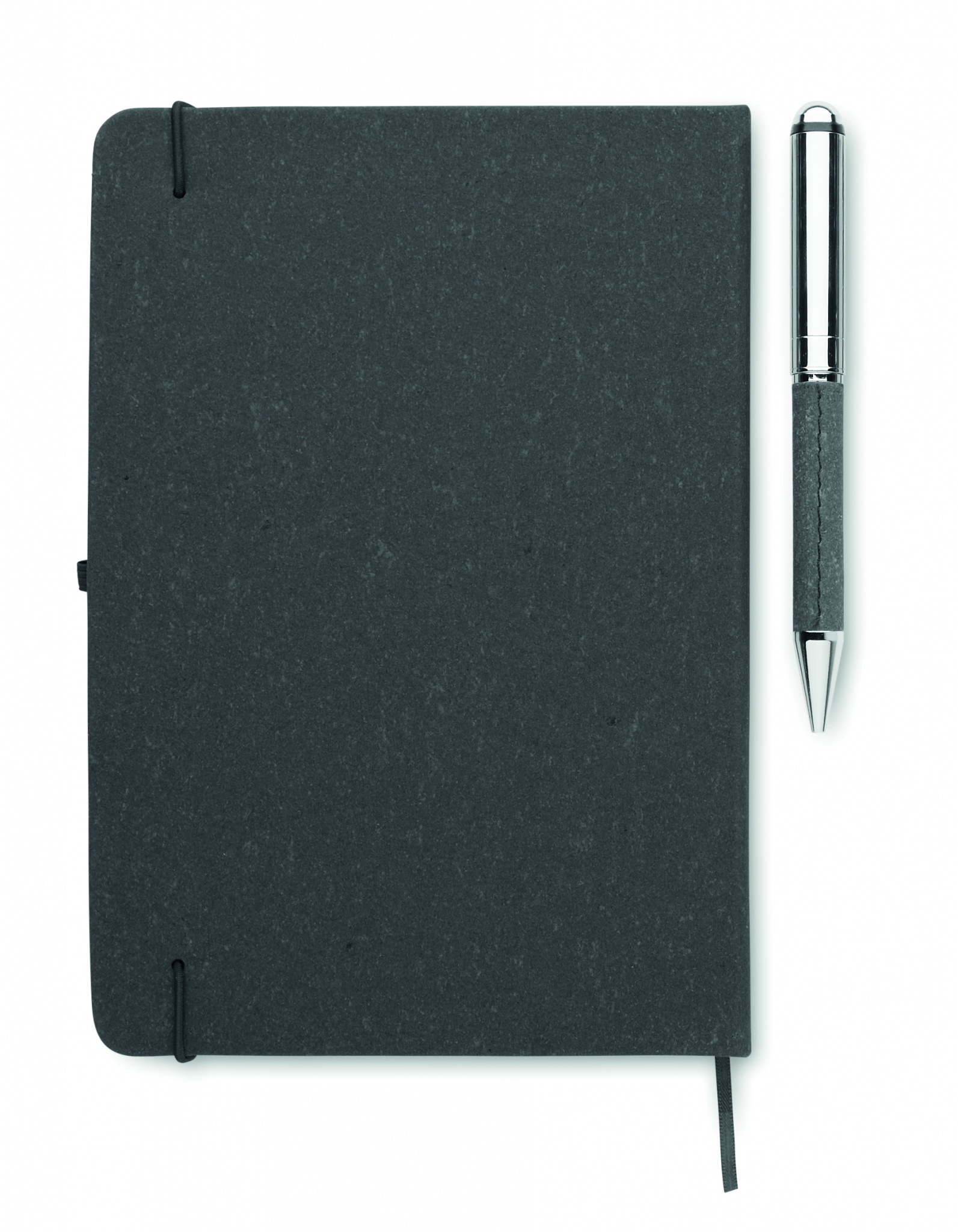 Gift set. Recycled leather (75%) A5 notebook with hard cover. Casebound. 160 lined pages made out of recycled paper (80 sheets). Matching elastic closure strap, ribbon page-marker and pen holder. Matching twist metal pen. Blue ink. Presented in a craft paper box.