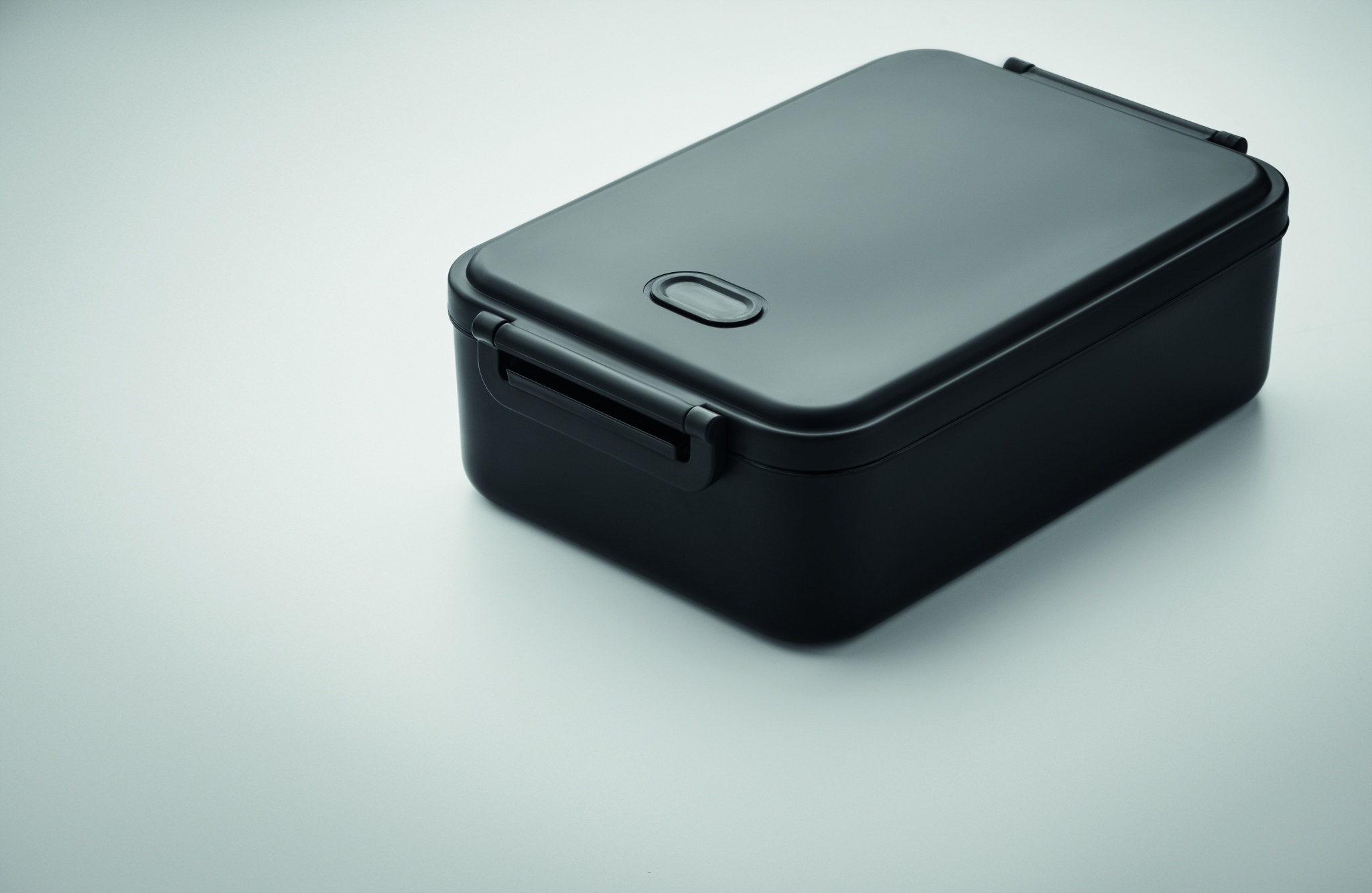 Large recycled PP lunch box with airtight lid, silicone valve and two side clasp closure. Capacity: 2200 ml.