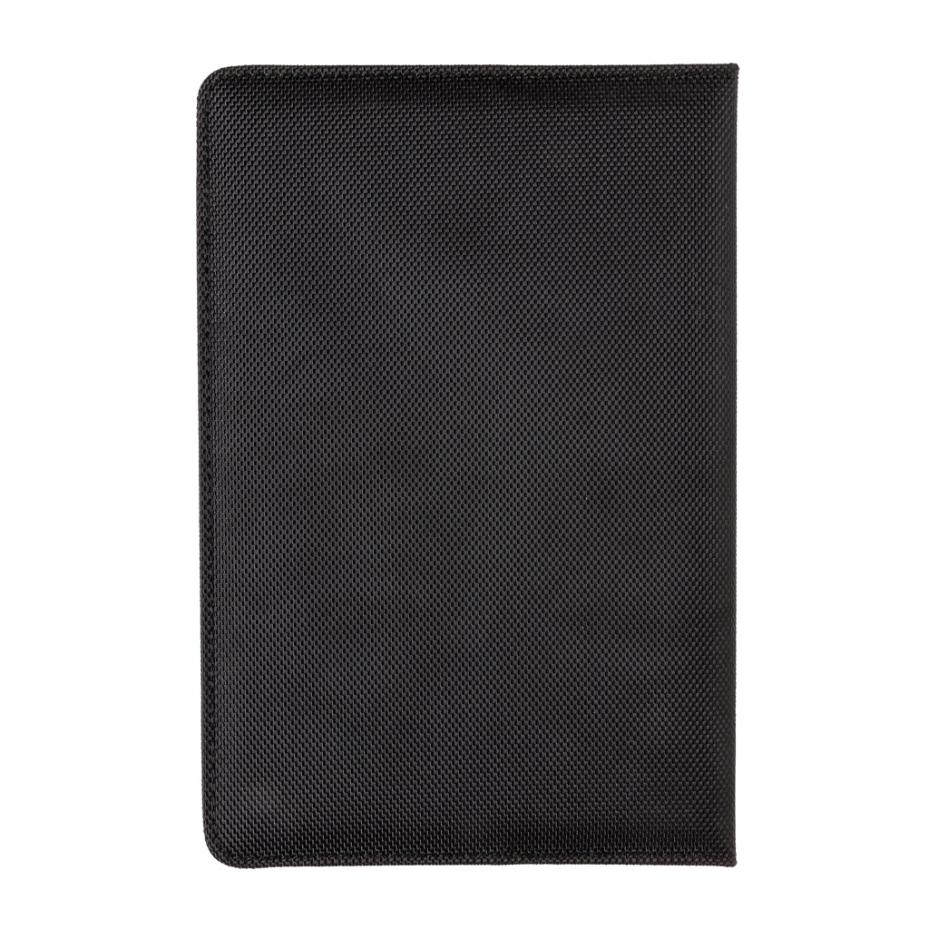 Executive 1680D and 600D polyester notebook cover with pen. Including removable notebook with 192 pages of 80g/m2 paper inside. Pocket on the cover can hold pen, cards, cash, mobile phone etc. Packed in Swiss Peak giftbox.