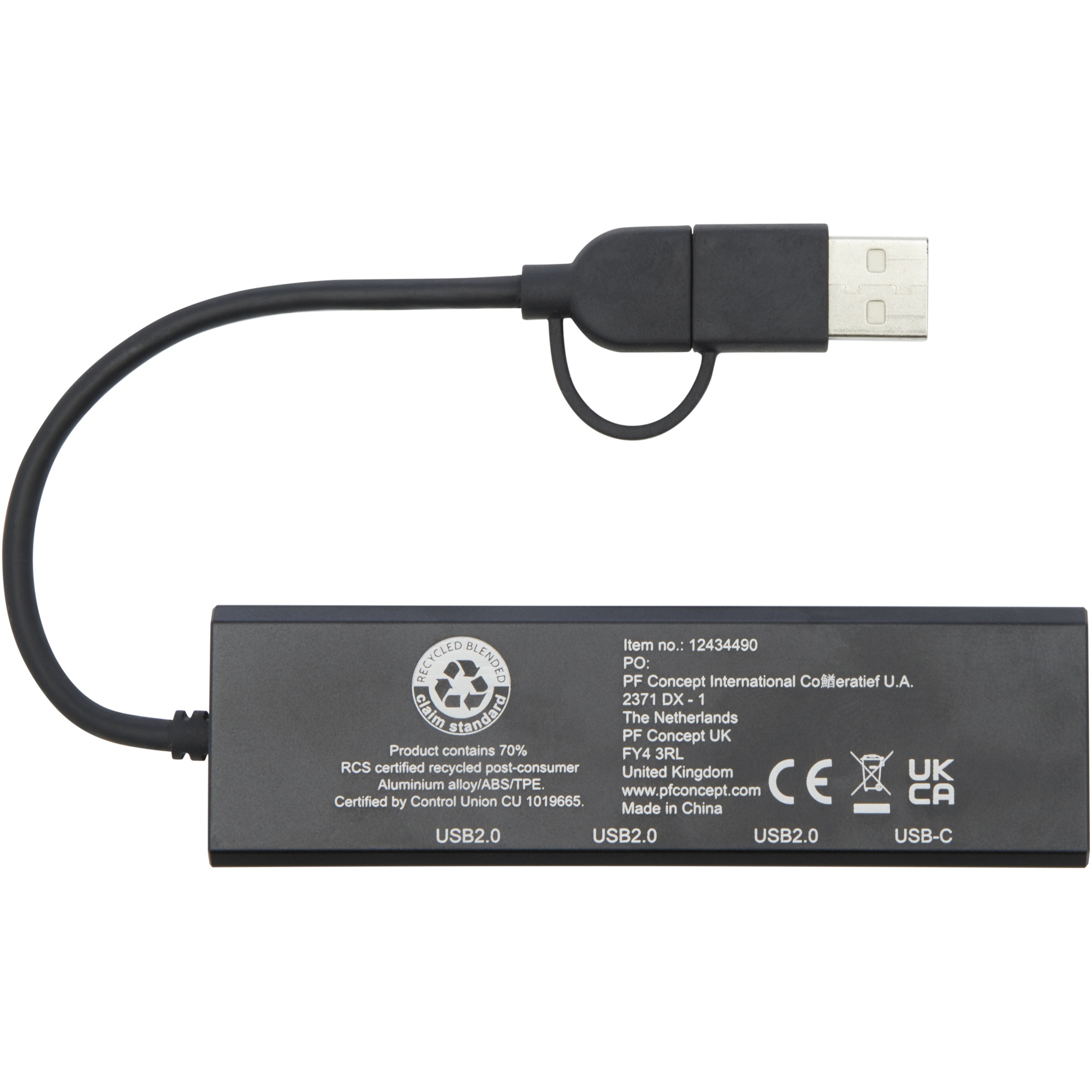USB 2.0 hub made from RCS recycled aluminium with an elegant rectangular recycled aluminium housing. It features 3x USB 2.0 ports and 1x Type-C PD (Power Delivery) port which allows you to transfer data with a transfer speed of up to 480 Mbps. The included Type-C input adapter enables you to use this device with both USB-A and Type-C equipped notebooks and computers. Delivered in a 100% recycled kraft paper box with a colourful sticker.