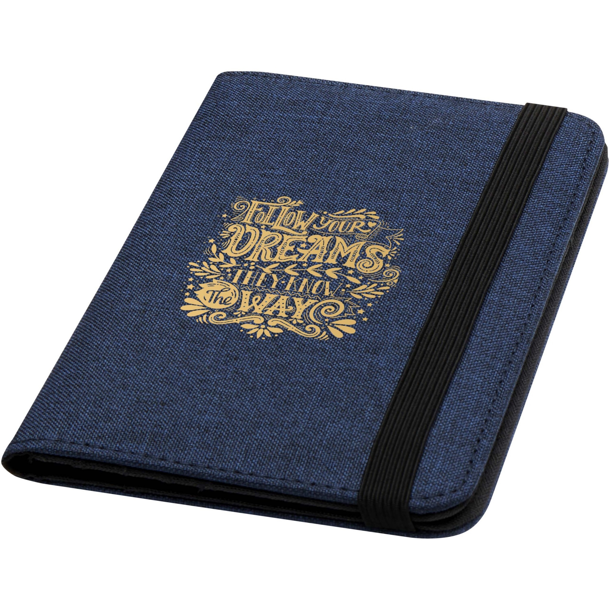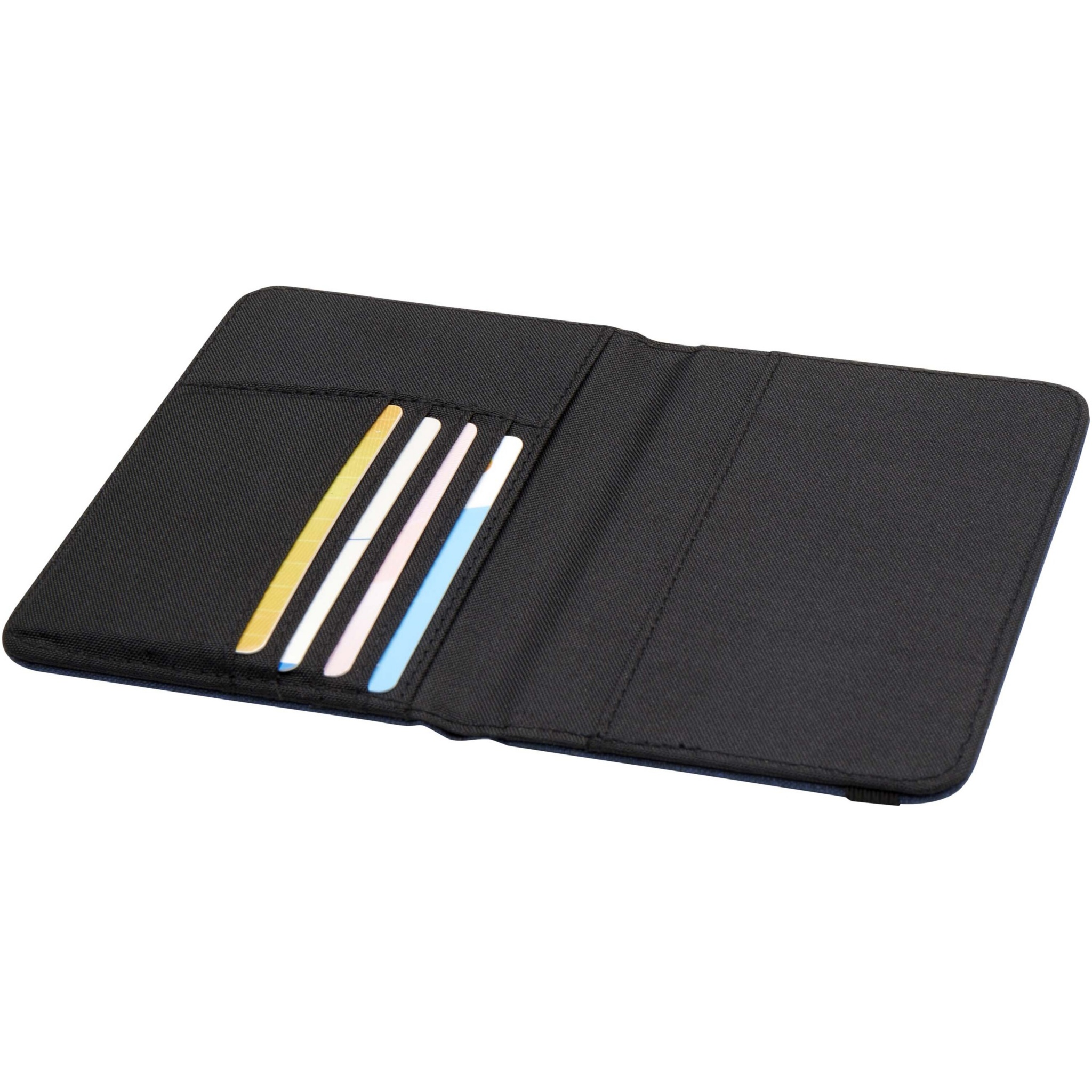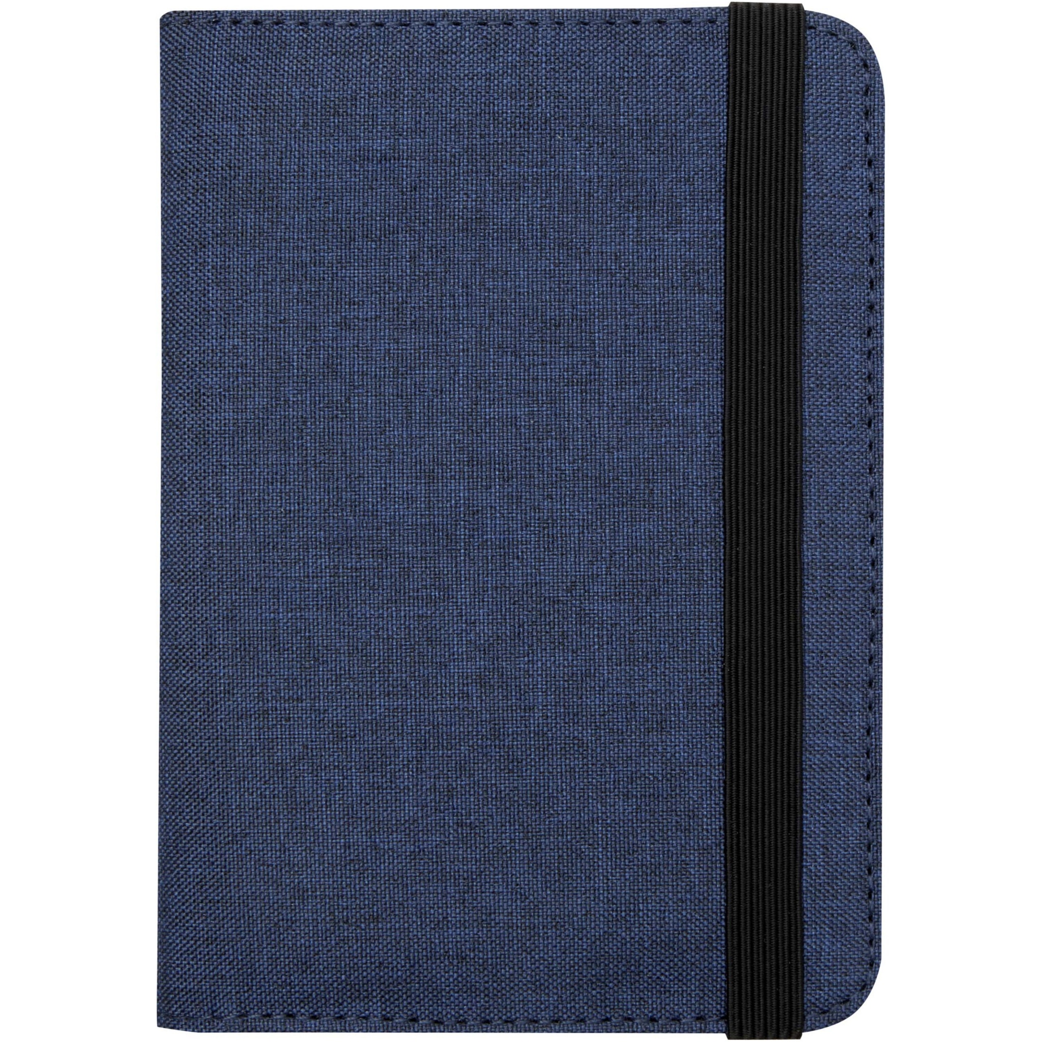 The Ross RFID passport holder is made of recycled polyester and is ideal for people constantly on the go, featuring dedicated pockets for passport, tickets, credit cards, and other items. Comes with an elastic band closure to keep the contents safe and secure.