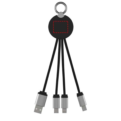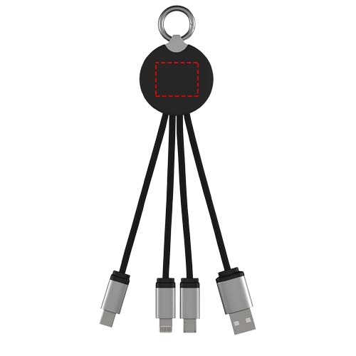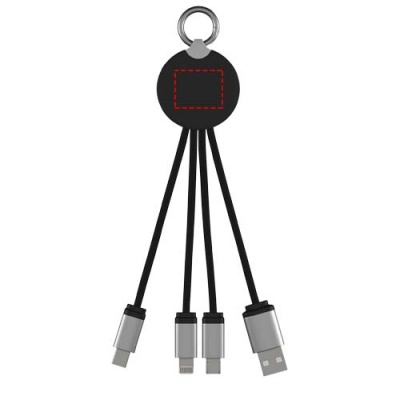 Light-up logo charging cable with rubber and metal finish fitted with three connectors (Type-C, Android, iPhone). Up to three devices can be charged simultaneously. Length of cables (including plugs): 10 cm. Recycled PET plastic cable and packaging is made of recycled paper and recycled plastic.