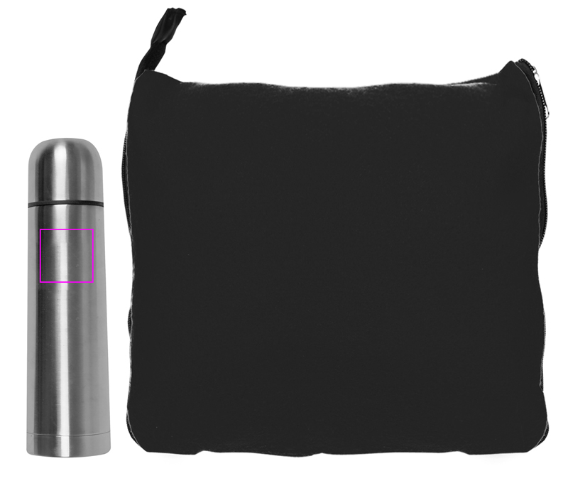 Perfect duo! Your customers will have all they need for a cuddly evening or a journey with this nice set. You will receive a nice 2-in-1 fleece blanket (180 x 120 cm), which can be converted to a pillow by means of the attached zipper and a thermal flask with 500 ml content. We will either engrave your logo on the flask or by means of embroidery on the blanket. Single-packed in box.