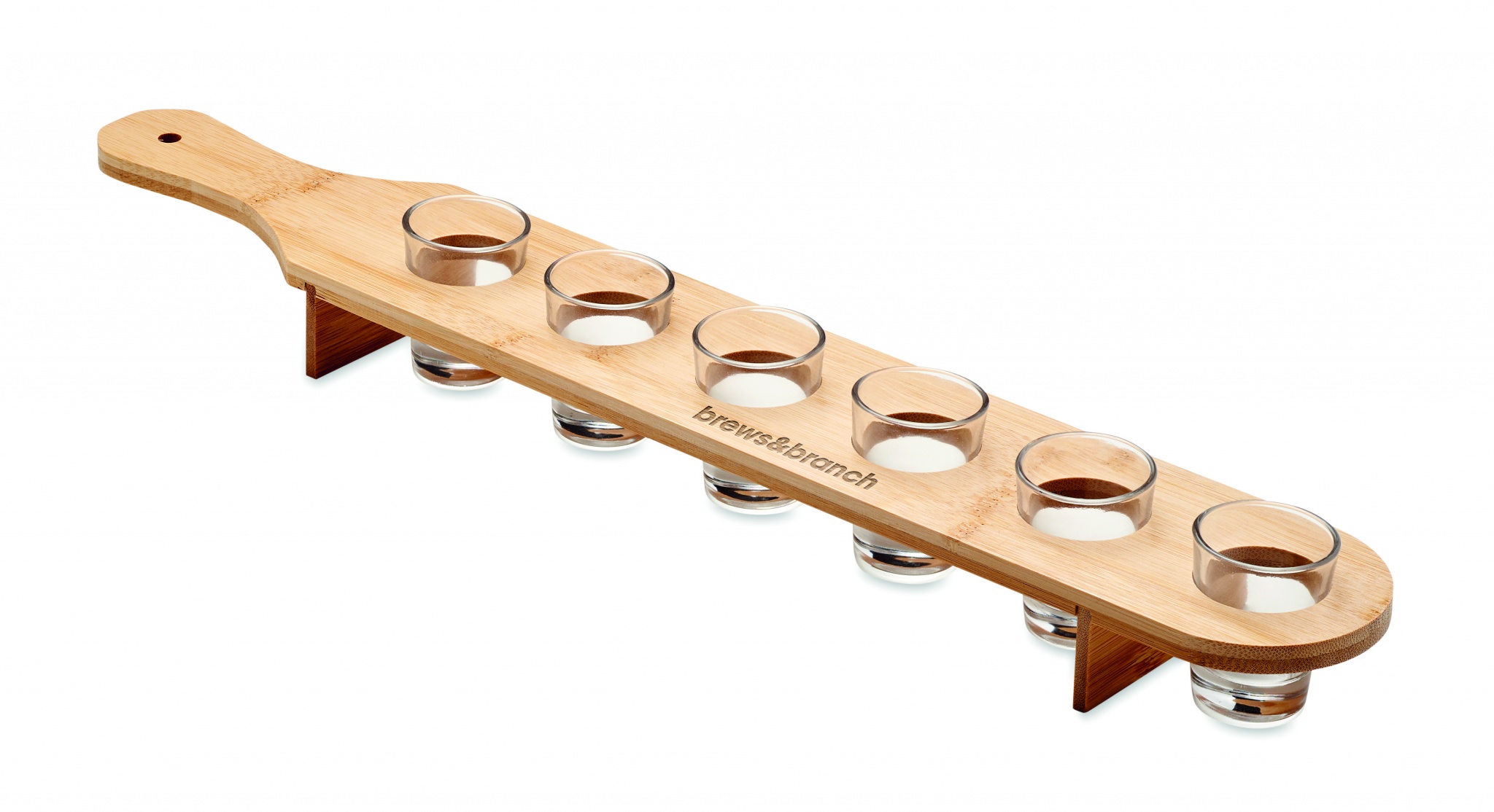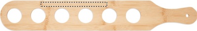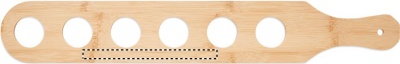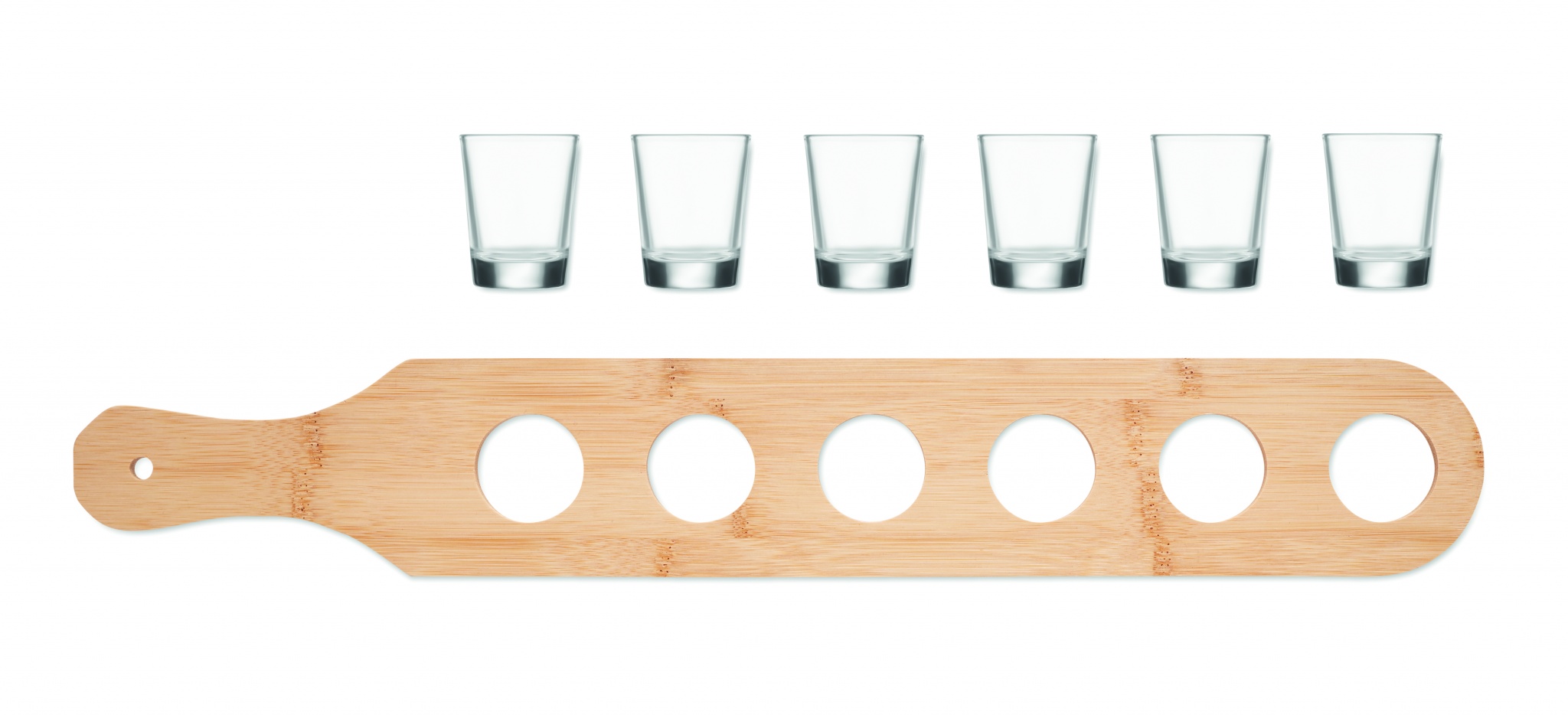 Set of 6 shot glasses on a bamboo paddle tray. Capacity: 20 ml. Bamboo is a natural product, there may be slight variations in colour and size per item, which can affect the final decoration outcome.