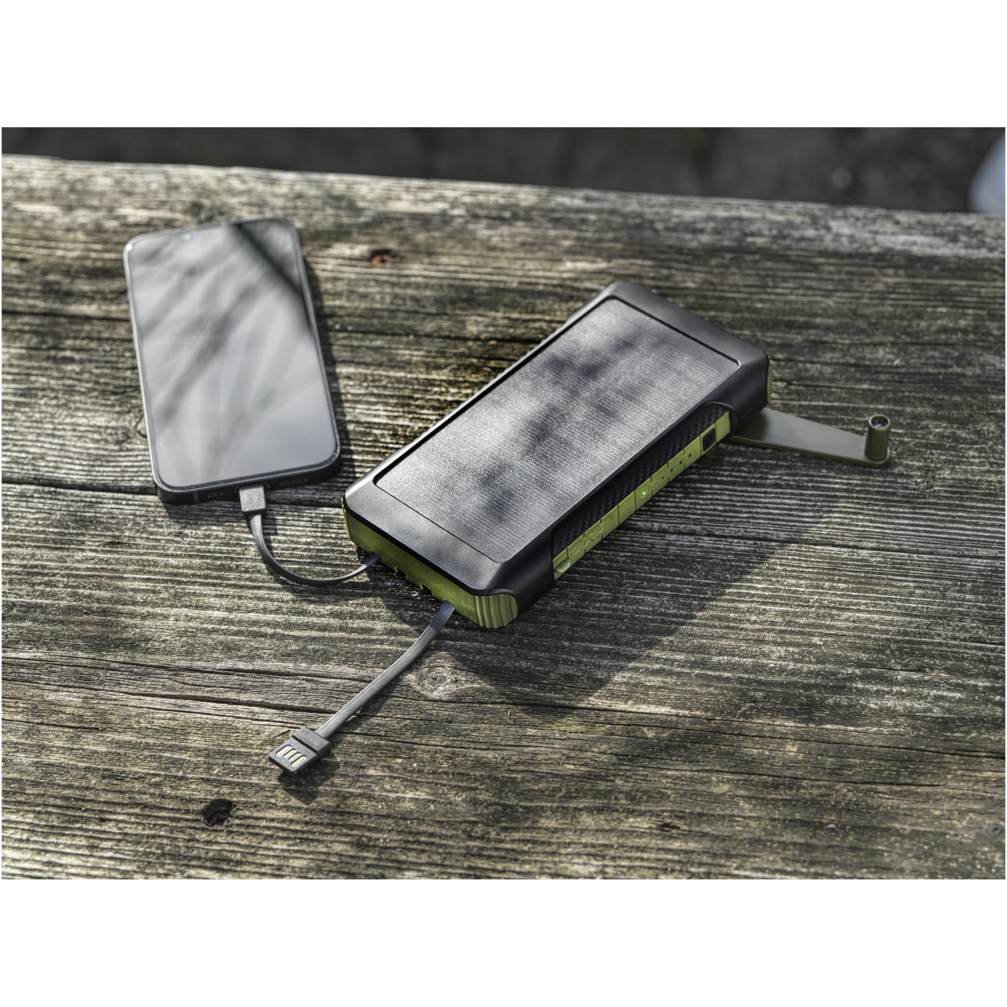 The Soldy RCS recycled plastic 10.000 mAh solar power bank is the ideal charging companion for outdoor activities. It is equipped with a hand-held crank dynamo to generate power manually in case you run out of power and there is no sunlight. The power bank can also be charged via the Type-C or the micro USB port on the device. Thanks to the built-in charging cables with Type-C, iOS, USB-A and micro USB connectors, this power bank allows you to charge most smartphones, cameras, power banks, earbuds etc. The power bank has a maximum output power of 2.4A per port. Input power is limited to 2A. Supplied with a user manual and a 30 cm USB-A to Type-C charging cable, and packed in a 100% recycled kraft paper box.